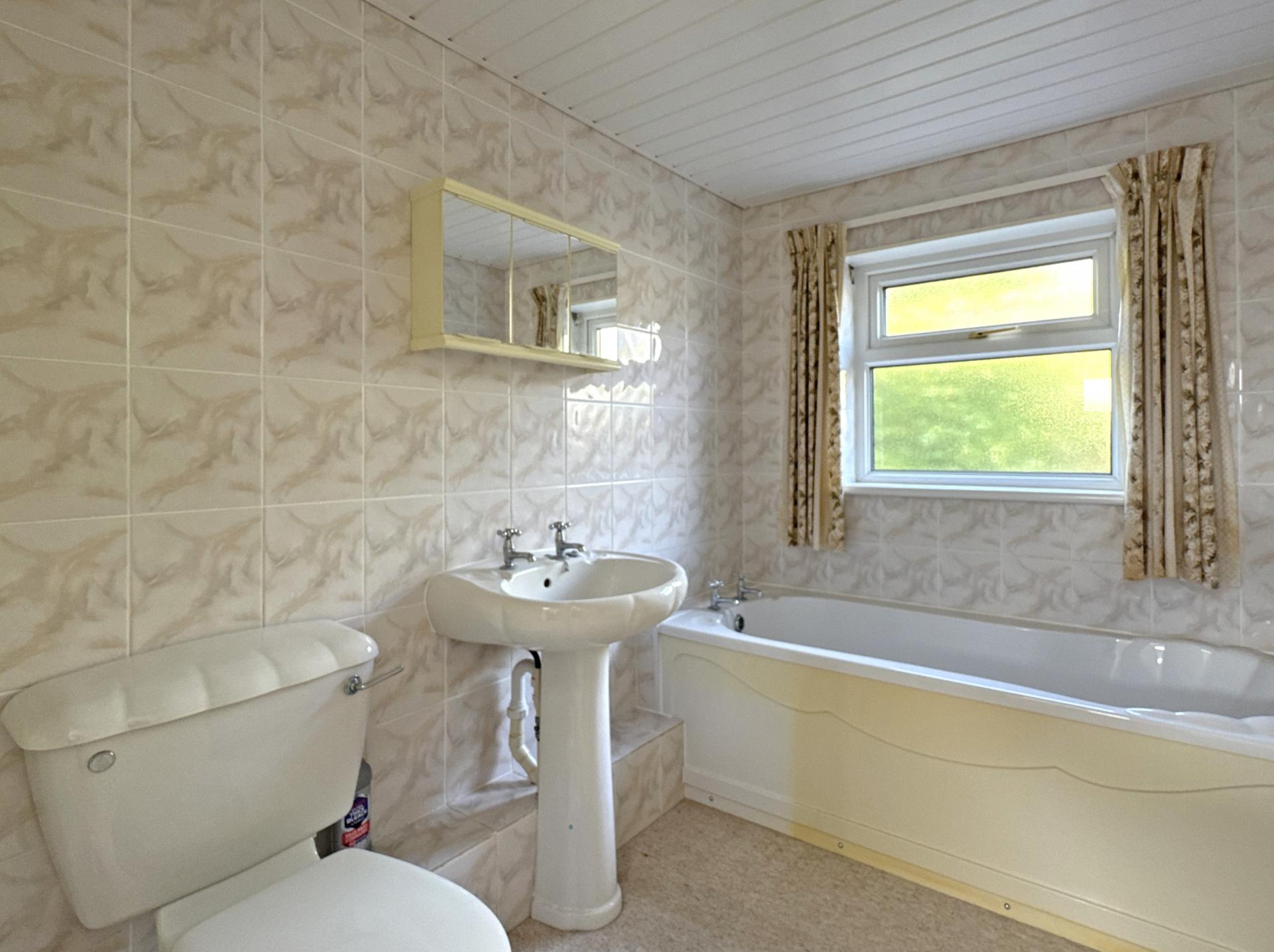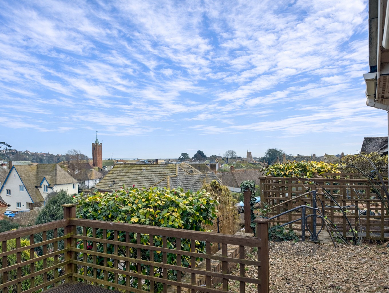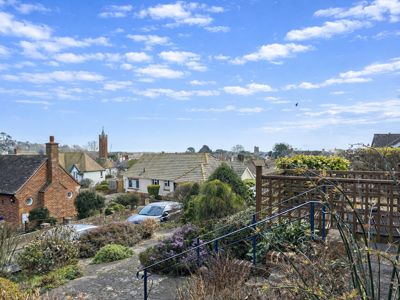 The bungalow stands at the back of a corner plot arranged with ease of maintenance in mind and enjoying a south easterly aspect. A decked patio accessed via the sitting room takes in a fine view over the town to the sea. A driveway provides off-road parking and leads to a single garage, with space and plumbing for a washing machine and a wall-mounted gas combination boiler.