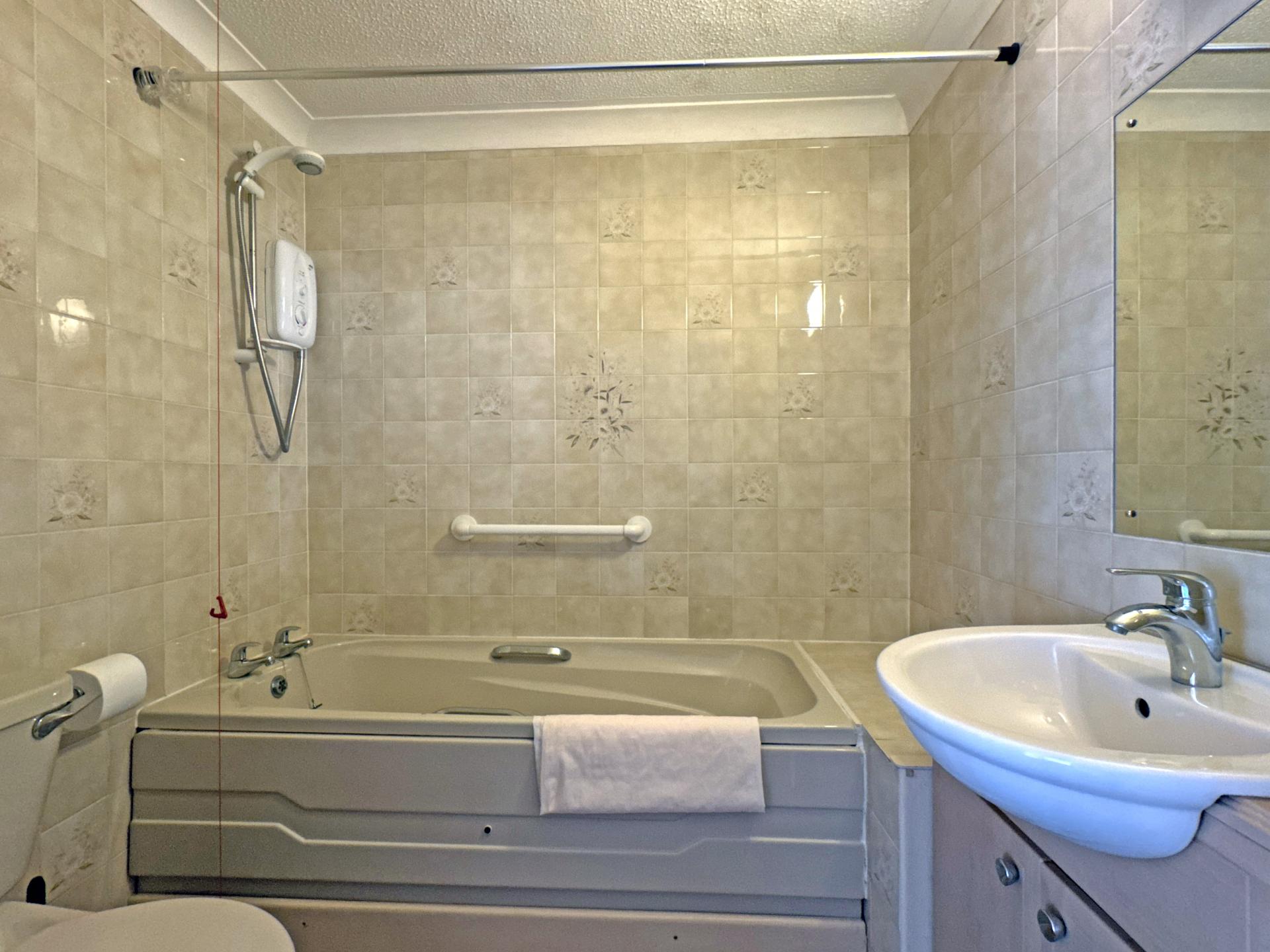 The double bedroom has an east facing window to the front aspect and a built in wardrobe. The bathroom has an electric shower over the bath, wash basin and WC.