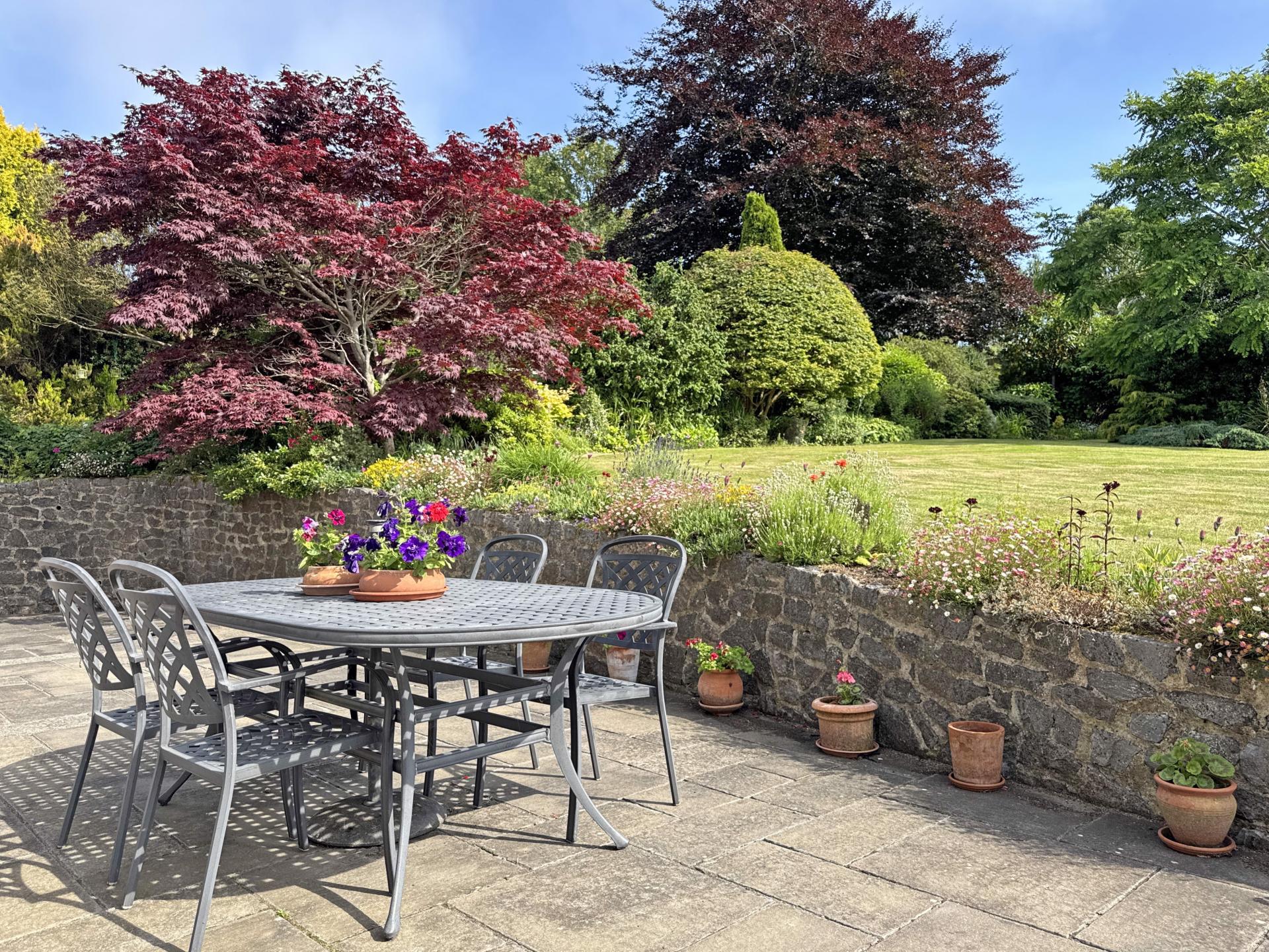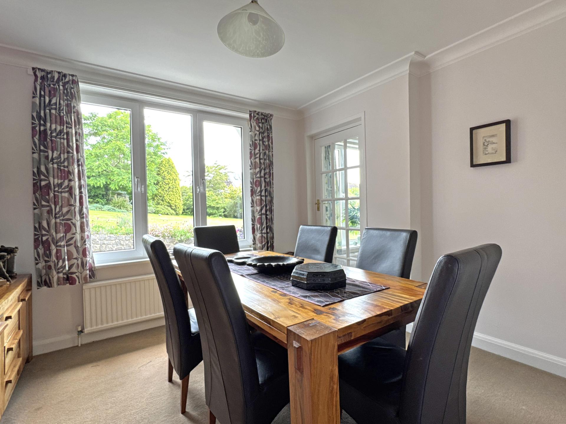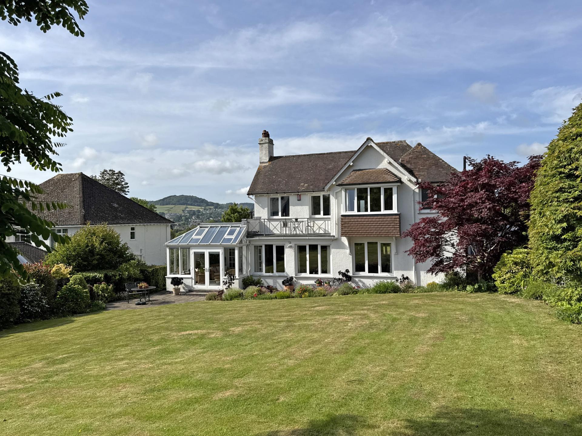 A separate dining room comfortably accommodates a table of six, has a south facing aspect into the rear garden and a connecting door to the sitting room. The large sitting room has two, south facing windows looking into the garden and with a connecting door into the garden room. Benefitting from a high ceiling that is partially double glazed, this impressive room looks south across the garden with doors opening onto the patio. Glazed, double doors open into a spacious study, enjoying views up The Sid Valley to Core Hill in the distance.