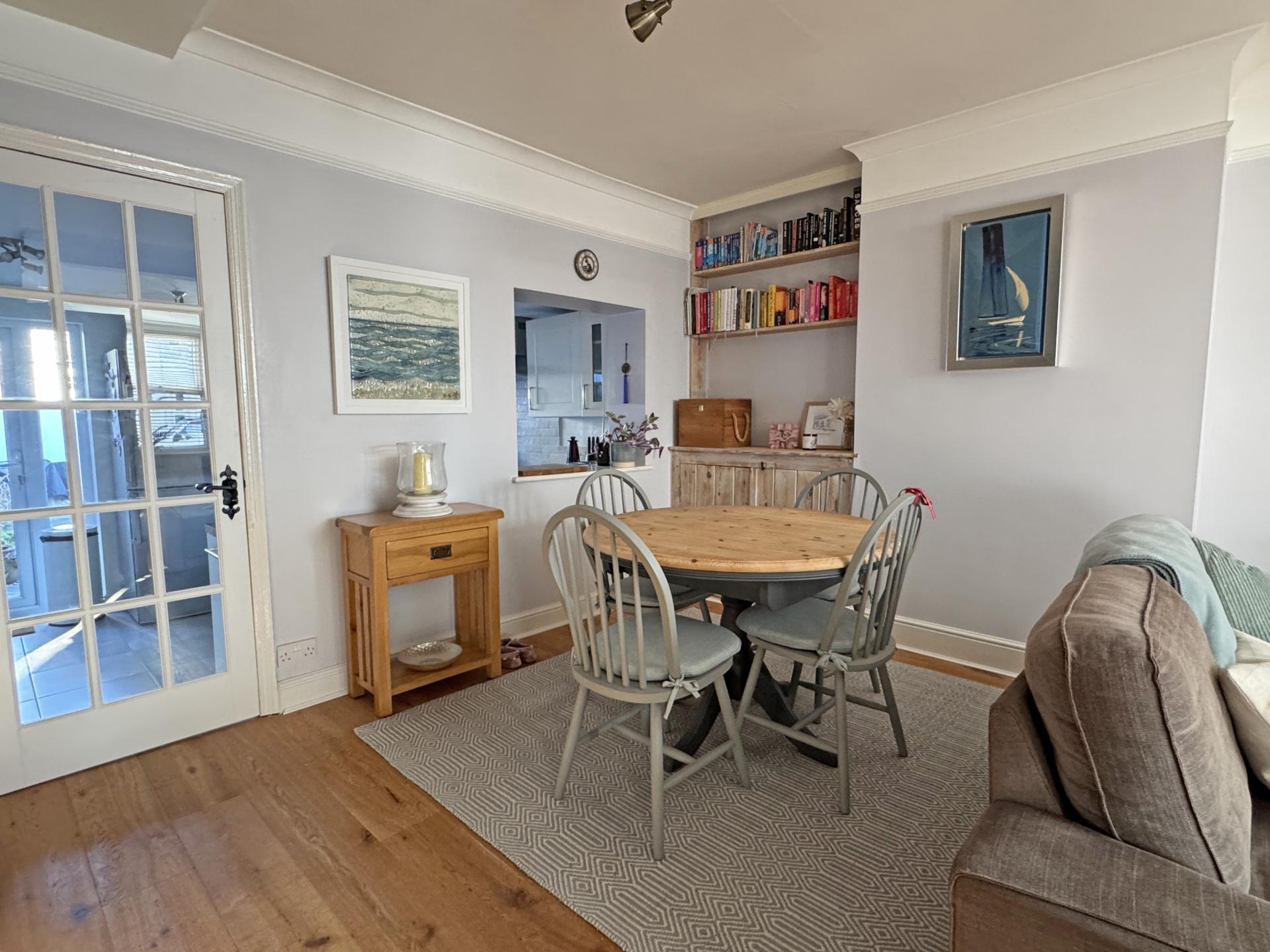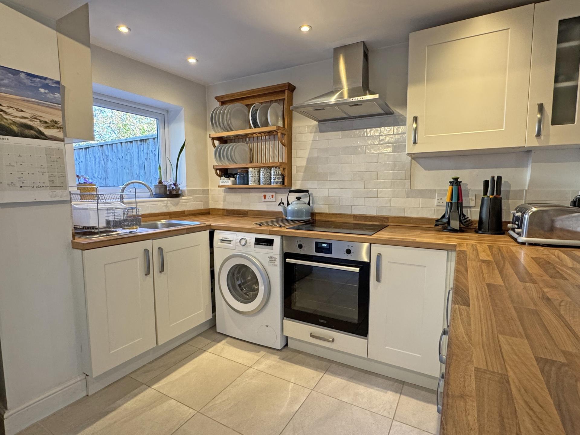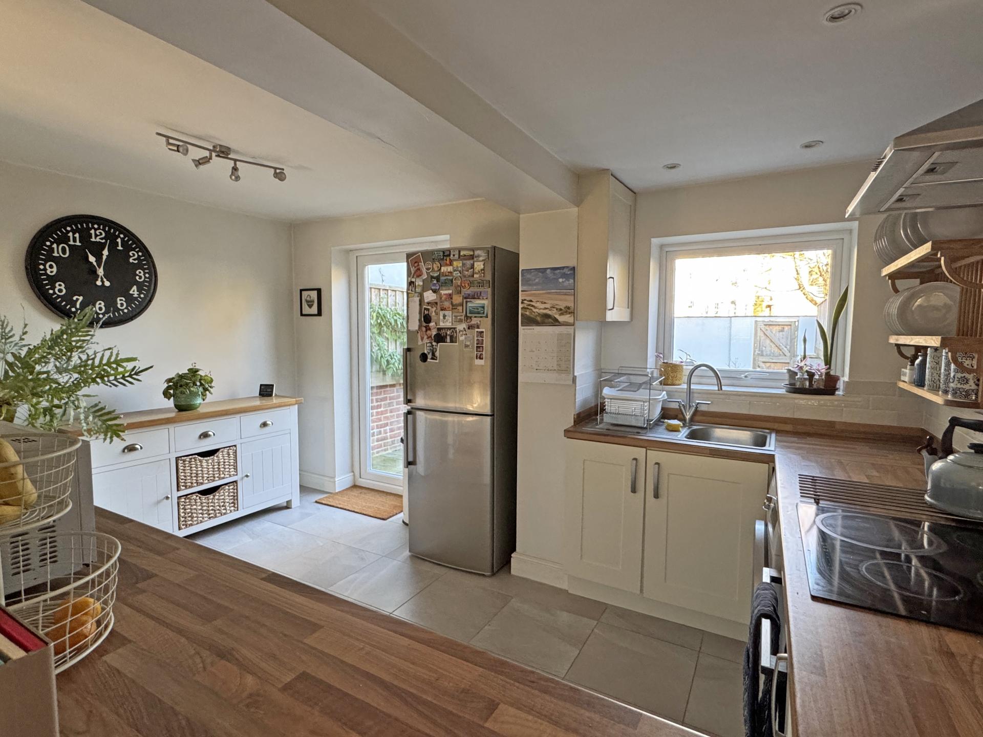 On entering the house an entrance hall has oak flooring along with the stairs rising to the upper floor and opens into a good size sitting/dining room, also having oak flooring. The sitting area enjoys a southerly aspect with a bay window and a fireplace features a wood burning stove. The adjoining dining area has storage cupboards and opens into the kitchen/breakfast room which is well fitted with a range of cupboards, drawers and worksurfaces, all providing ample storage. Built-in appliances comprise an electric oven, hob and cooker hood and there is space for a fridge/freezer, washing machine and slimline dishwasher.