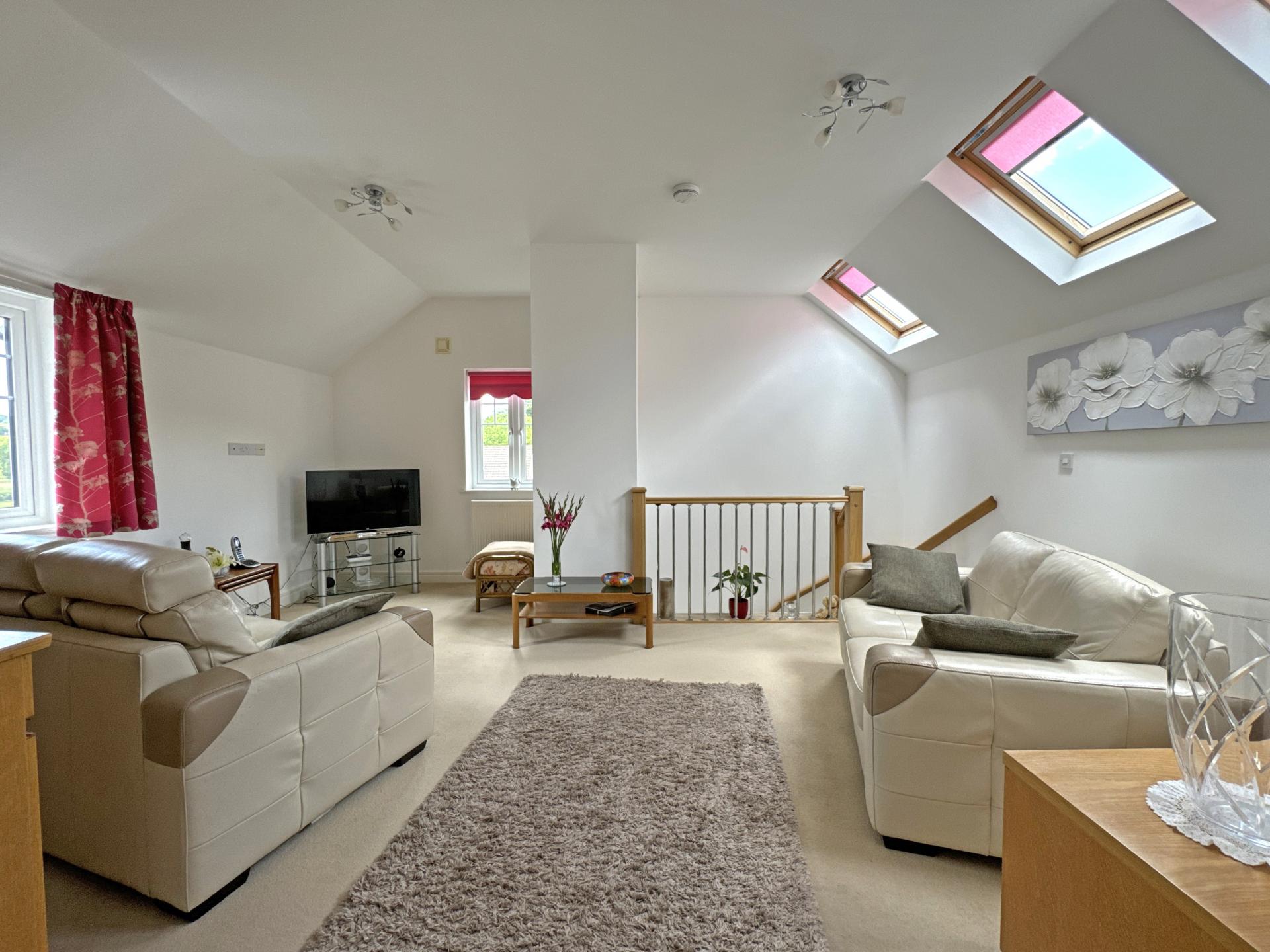 Presented in good order throughout, with double glazing and electric central heating is this two bedroom coach house flat. Once inside the entrance hallway has a connecting door to the garage which has a storage cupboard beneath the stairs. An open plan sitting/dining room has a vaulted ceiling and triple aspect windows to include three Velux’s. The room enjoys beautiful views over The Byes and River Sid, across The Sid Valley, looking in a westerly direction. A separate kitchen is fitted with a range of modern units to include a built-in electric hob, oven, grill and washing machine and with space for a fridge