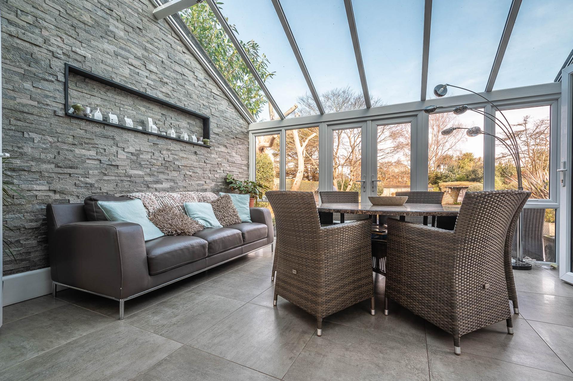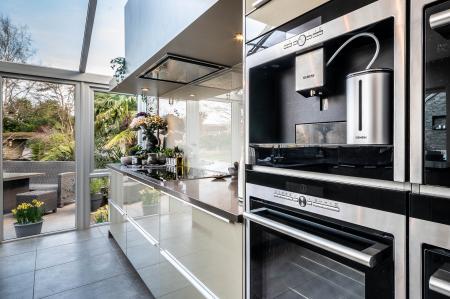 The luxurious German-fitted kitchen/breakfast room is superbly appointed with a central island and breakfast bar, extensive drawer units, an induction hob with extractor, integrated fridge, coffee machine, steam combi oven, and two additional ovens (one incorporating a microwave). A striking glass vaulted ceiling floods the space with natural light. The adjoining family room features a Mandarin Stone accent wall with discreet lighting, ideal for both family living and entertaining.