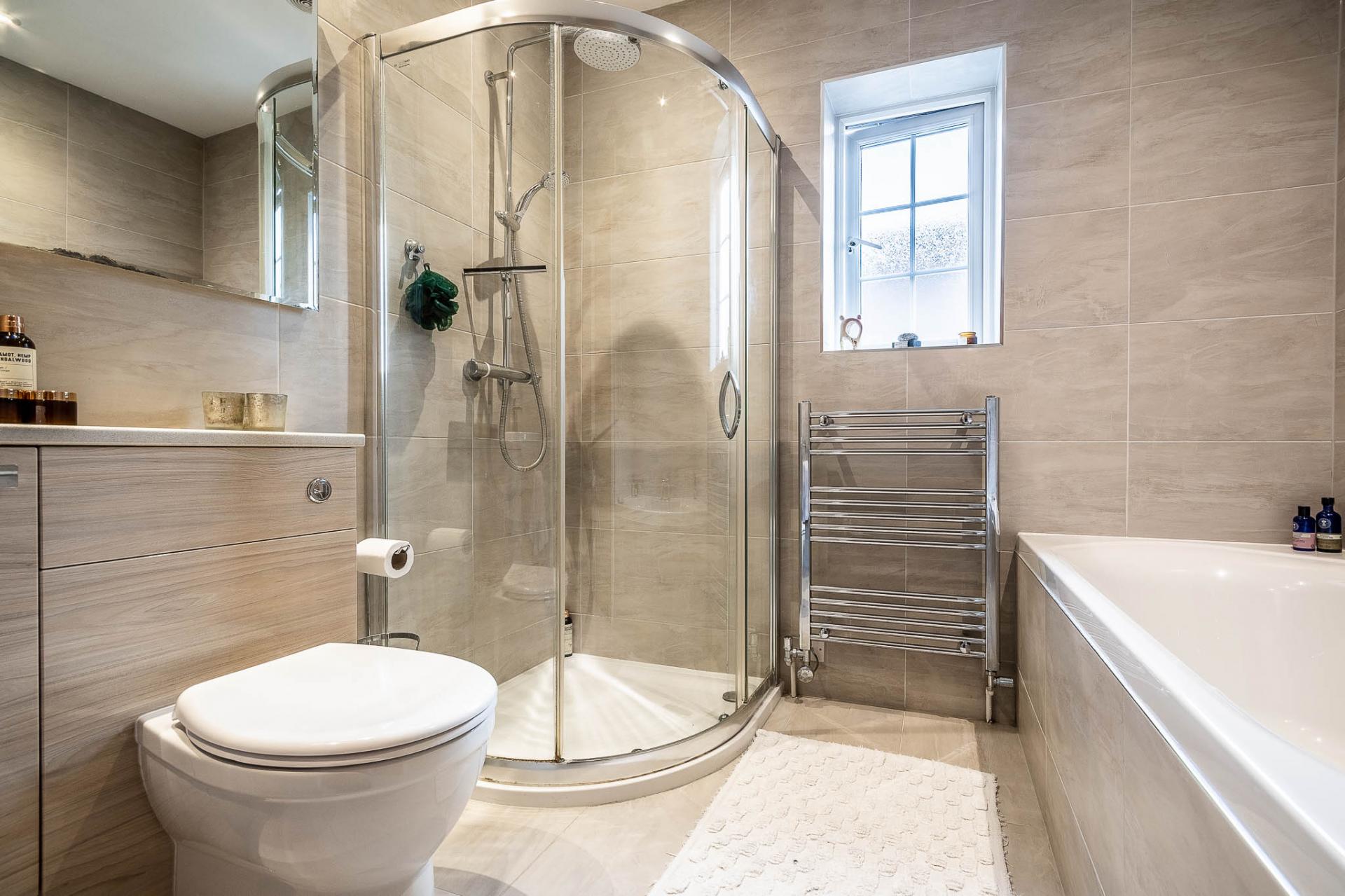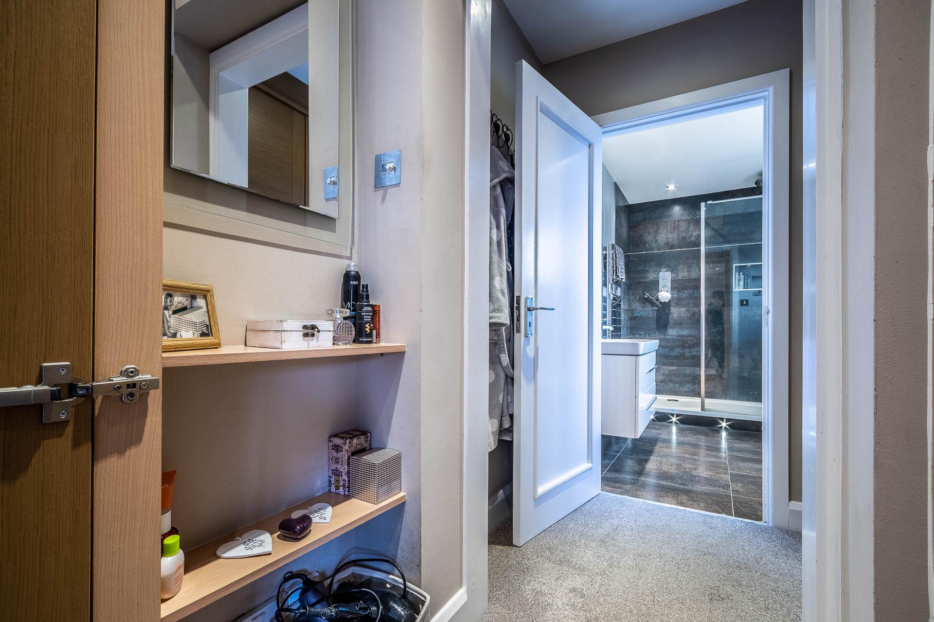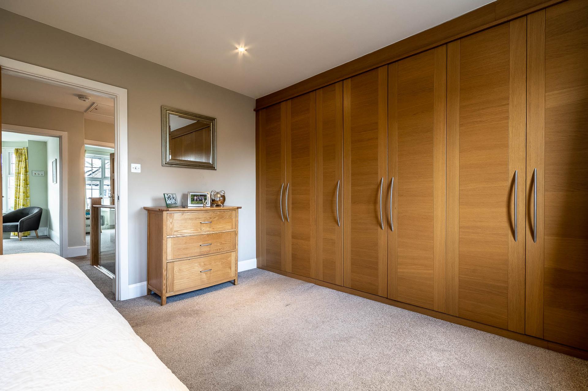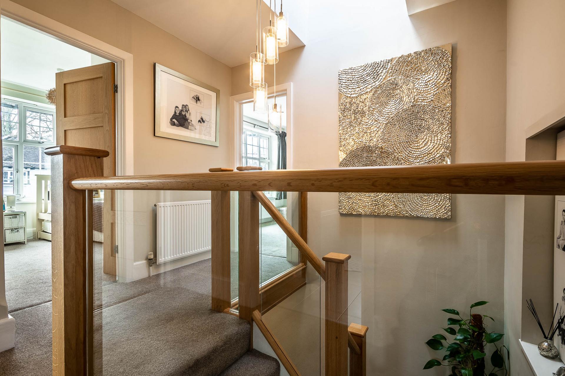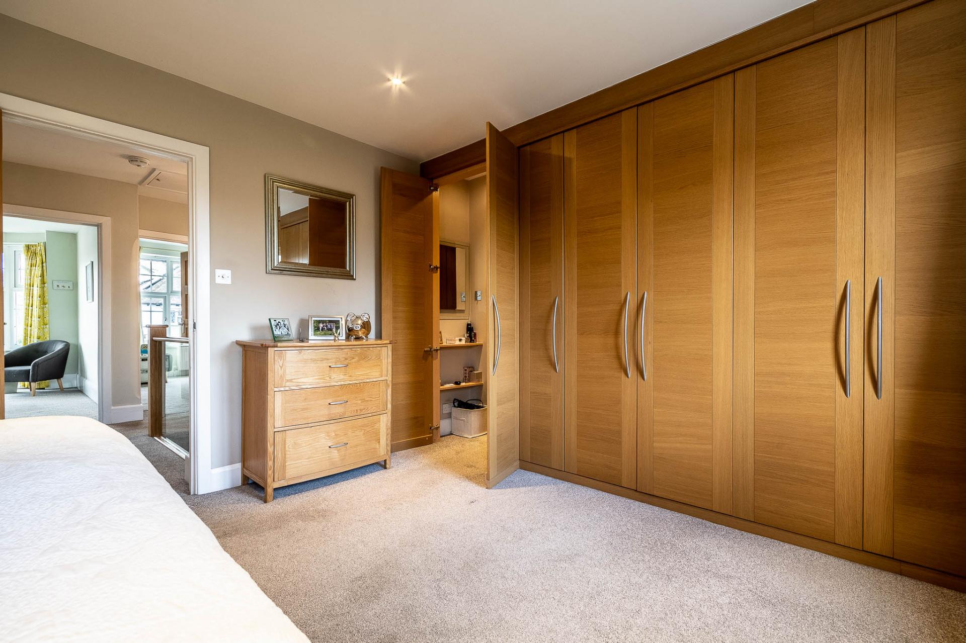 On the first floor, a superb galleried landing, crafted in oak and glass by Messrs Neville Johnson, serves as an impressive focal point, enhancing both the sense of space and natural light. The highlight of this level is the exquisite principal bedroom suite, complete with a full range of Sharps fitted wardrobes and a discreet dressing area with additional storage, leading through to a spacious en-suite shower room. There are three further well-proportioned bedrooms, complemented by a newly fitted family bathroom/shower room.