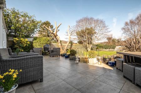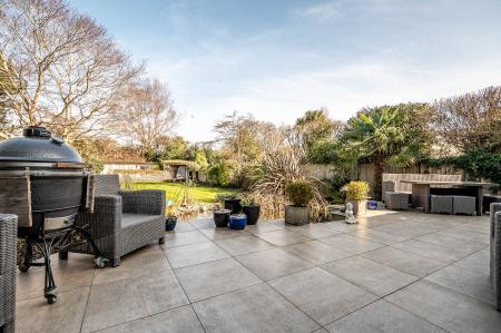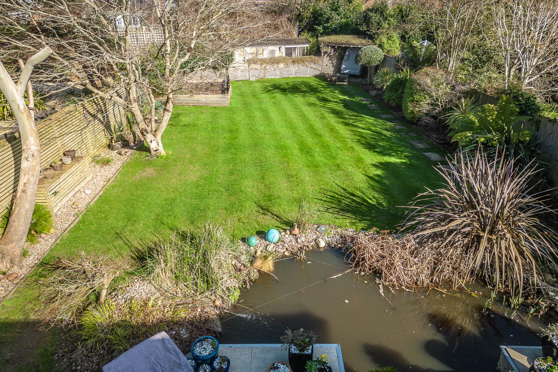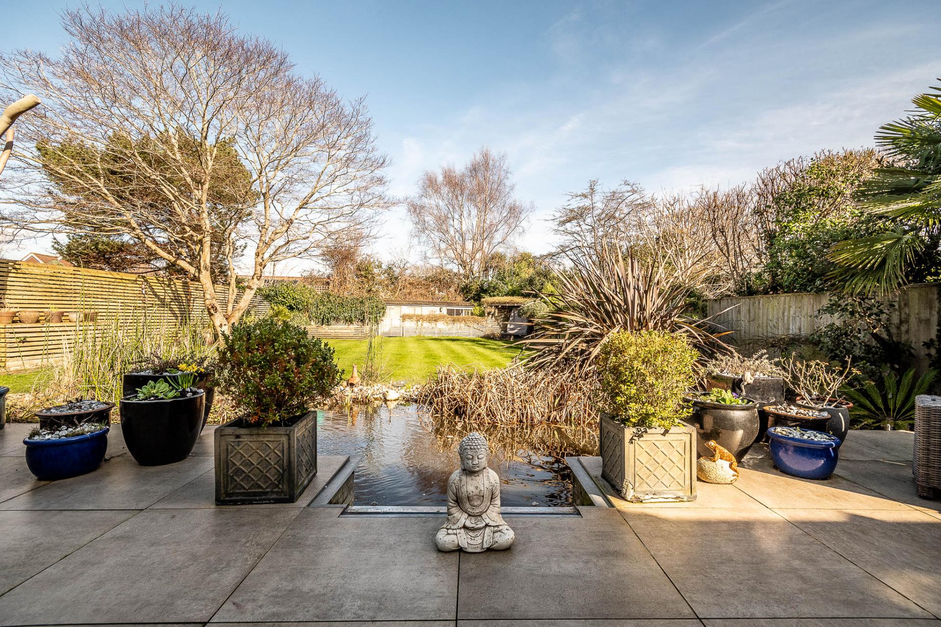The property benefits from a professionally landscaped garden, thoughtfully designed with lighting to create an inviting ambiance. A full-width ceramic-tiled patio overlooks a large pond with a striking blade-style waterfall, complete with integrated lighting. The garden has been styled with a Mediterranean influence, featuring palm trees, an olive tree, and a large acer, all enhanced by carefully positioned lighting. Two generously sized sheds and a dog run/kennel—easily convertible into an additional shed—provide practical storage, while the remainder of the garden is predominantly laid to lawn. Side gates provide convenient access on either side of the property.