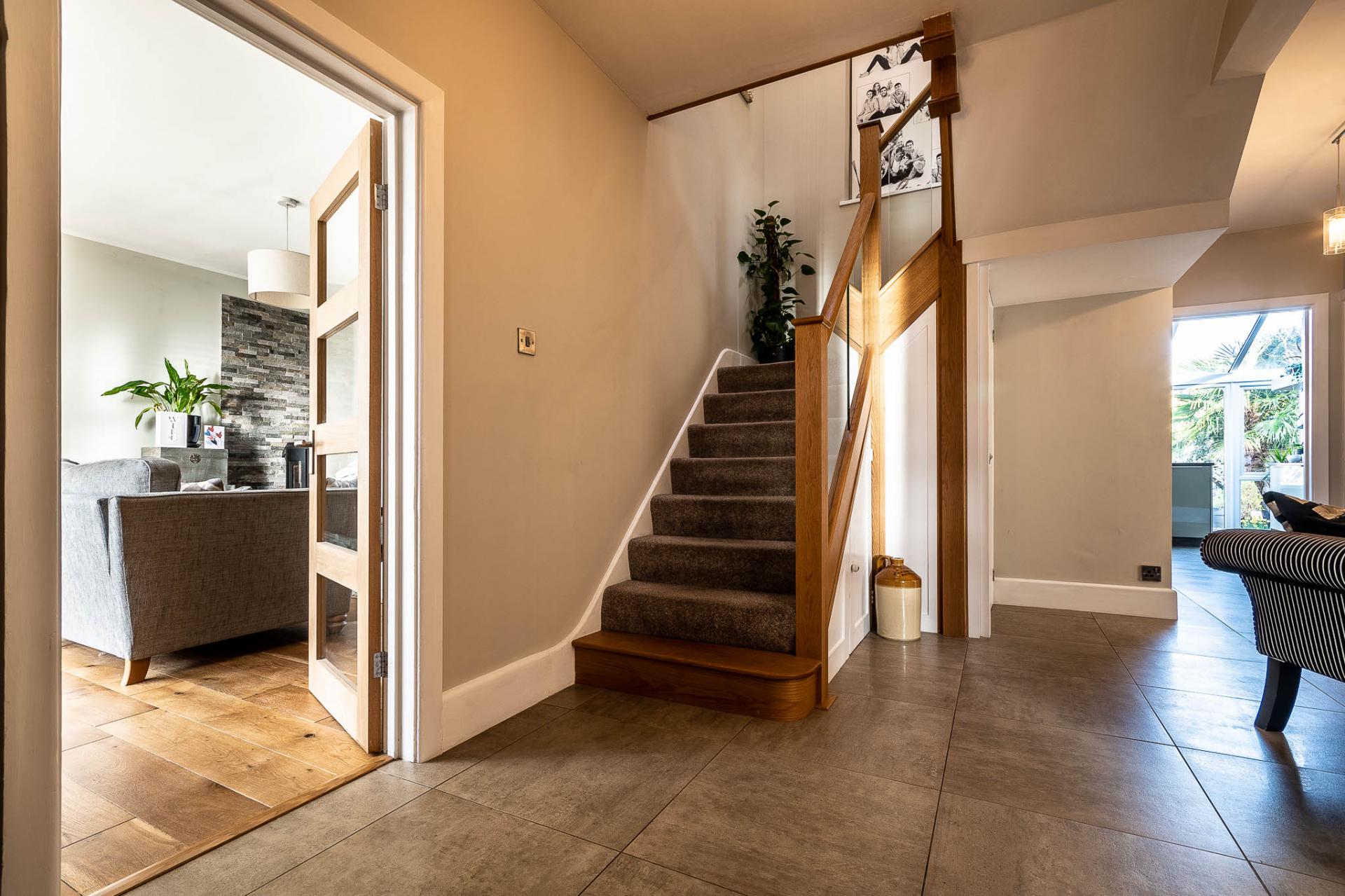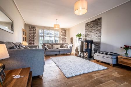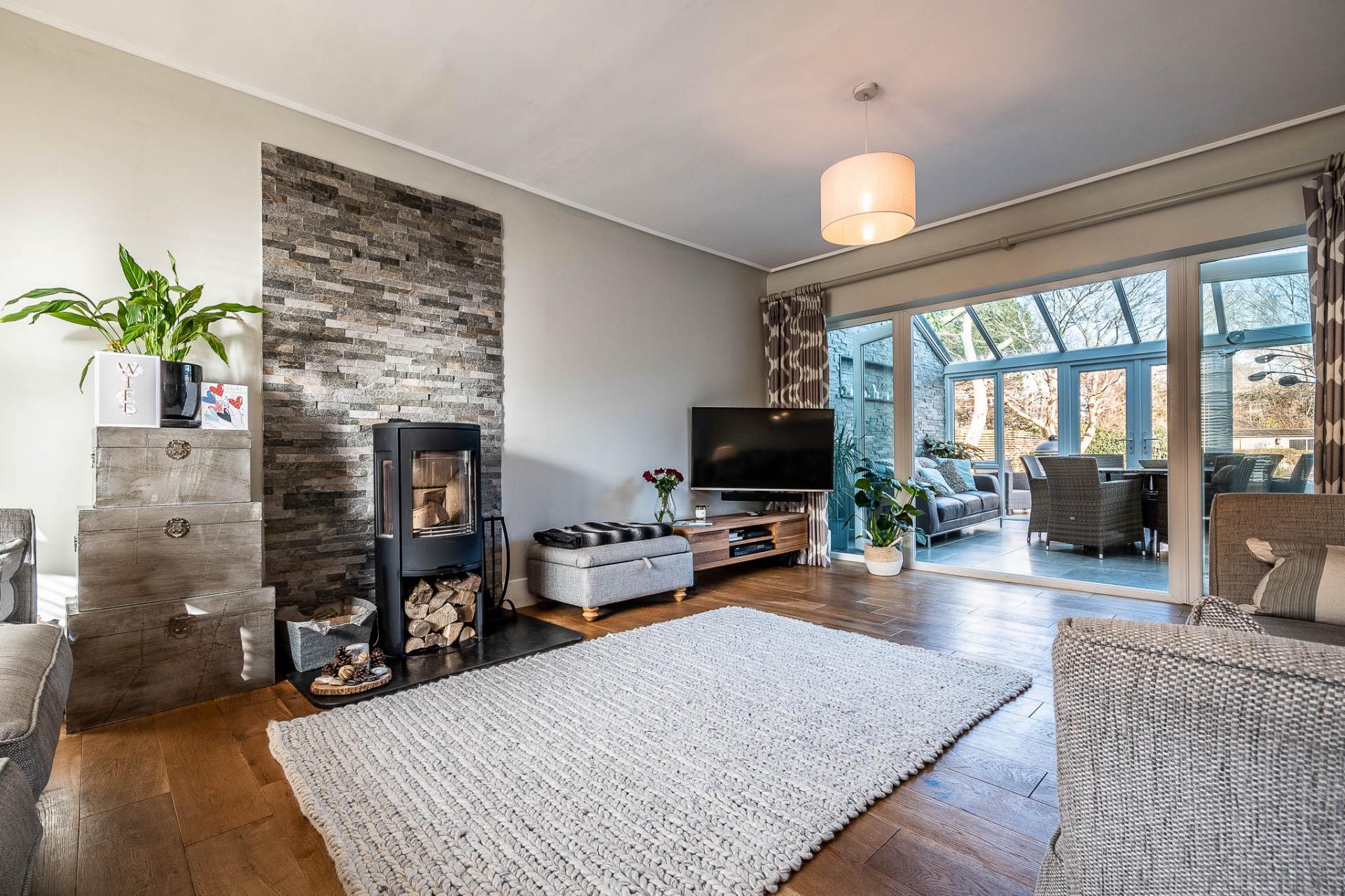 On the ground floor, a welcoming entrance hall with underfloor heating sets the tone. The generous sitting room boasts high ceilings, oak flooring, and a modern log burner with a Mandarin Stone backdrop, creating a stylish yet cosy living space.