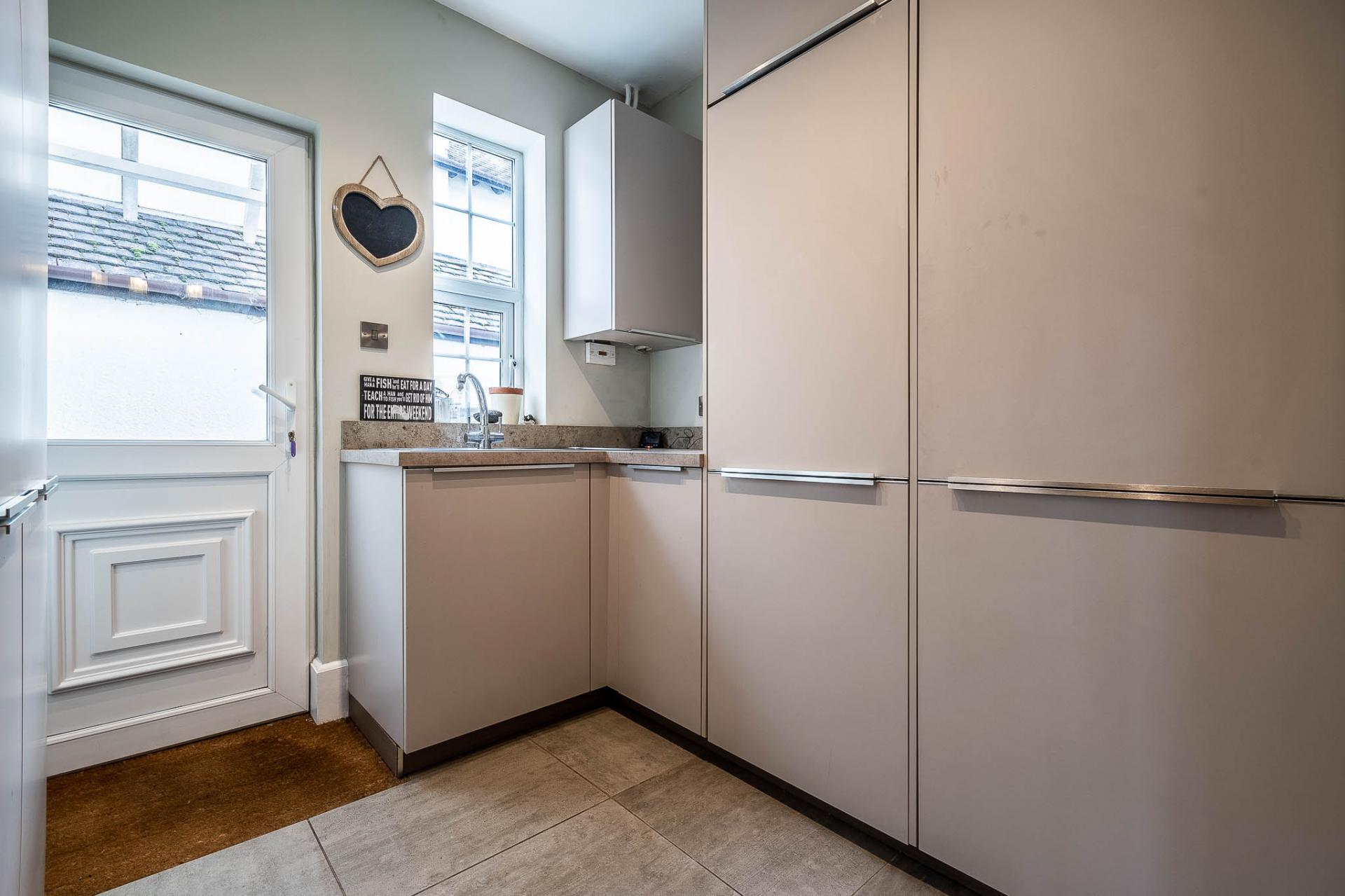 A versatile dining room, which could serve as a fifth bedroom, benefits from a bay window and feature fireplace. Completing the ground floor is a well-equipped utility room with modern units, built-in freezer, and plumbing for both a washing machine, tumble dryer, and a cloakroom.