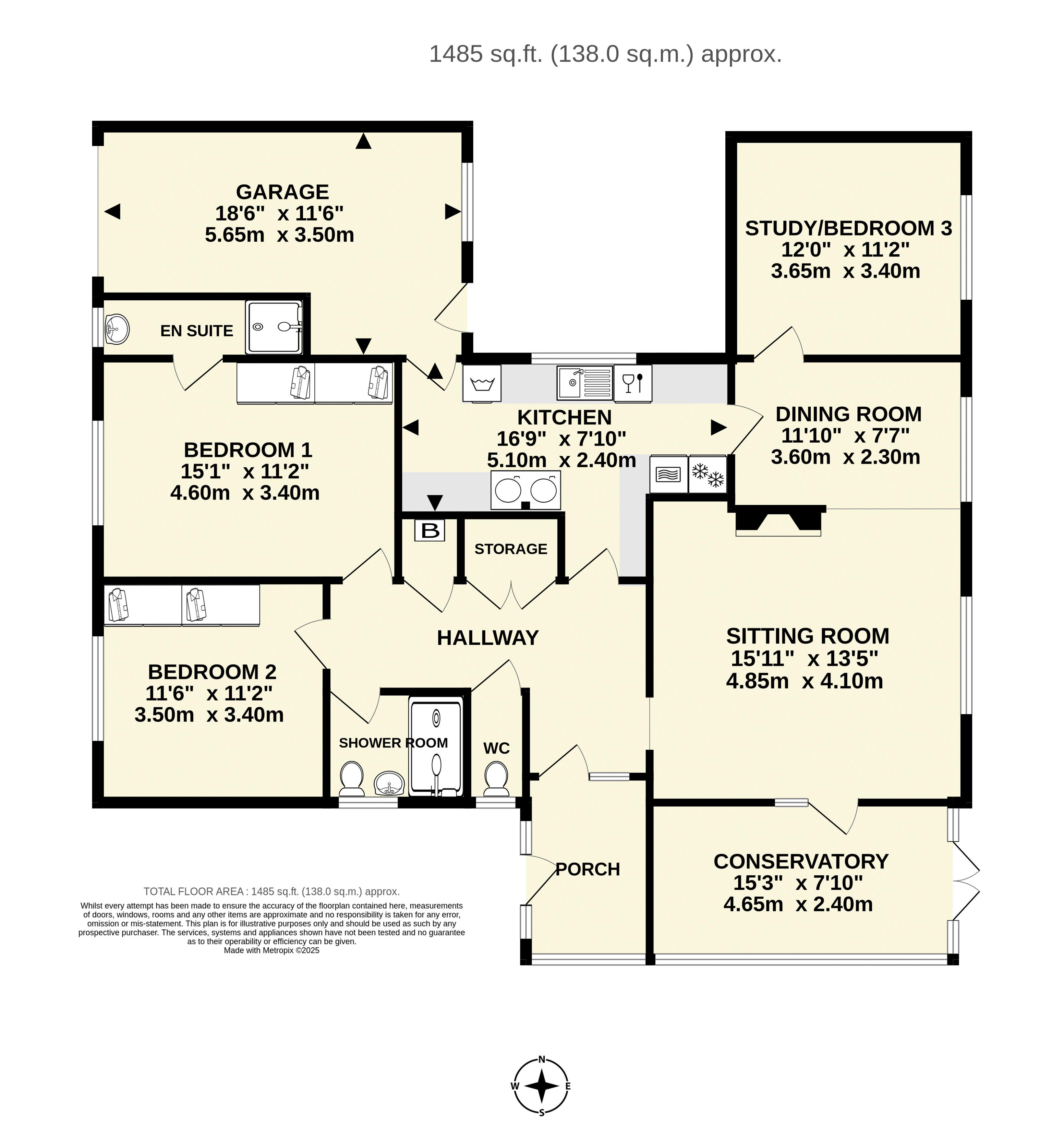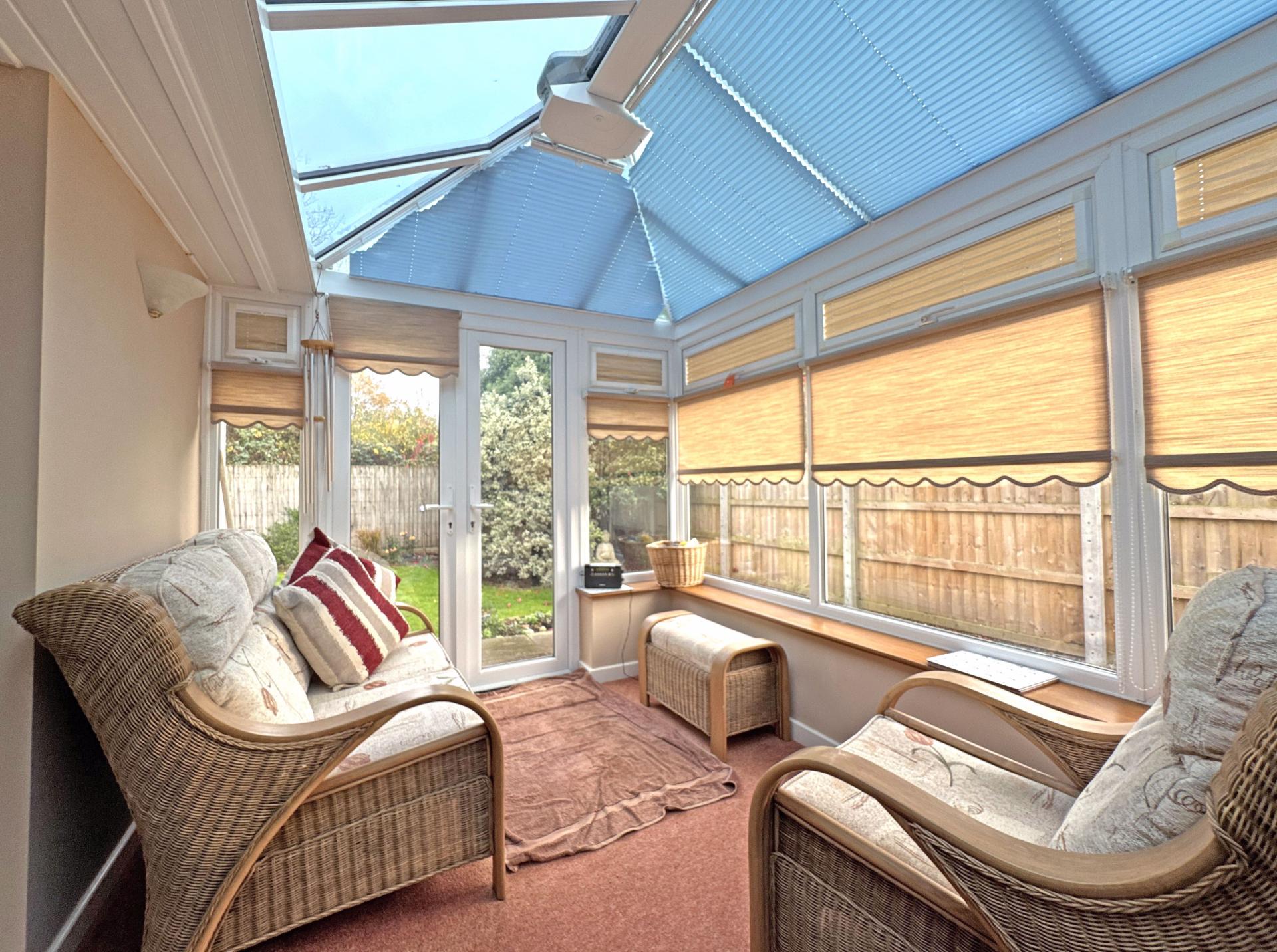 Presented well and with gas central heating and double glazing throughout, this detached bungalow was built in the 1980’s and provides flexible accommodation thanks to a good size study that could serve as a third double bedroom if required. An entrance porch with space for storage and coats leads to the main hallway which has excellent storage by way of deep cupboards, one housing a modern gas combination boiler. A spacious, open plan sitting/dining room has two large windows looking into the rear garden which faces east. An adjoining, double glazed conservatory features a hipped, double glazed roof and patio doors opening into the garden. The kitchen is fitted with a range of units to include a built-in oven, grill, dishwasher, washing machine, fridge/freezer and features an electric Aga.