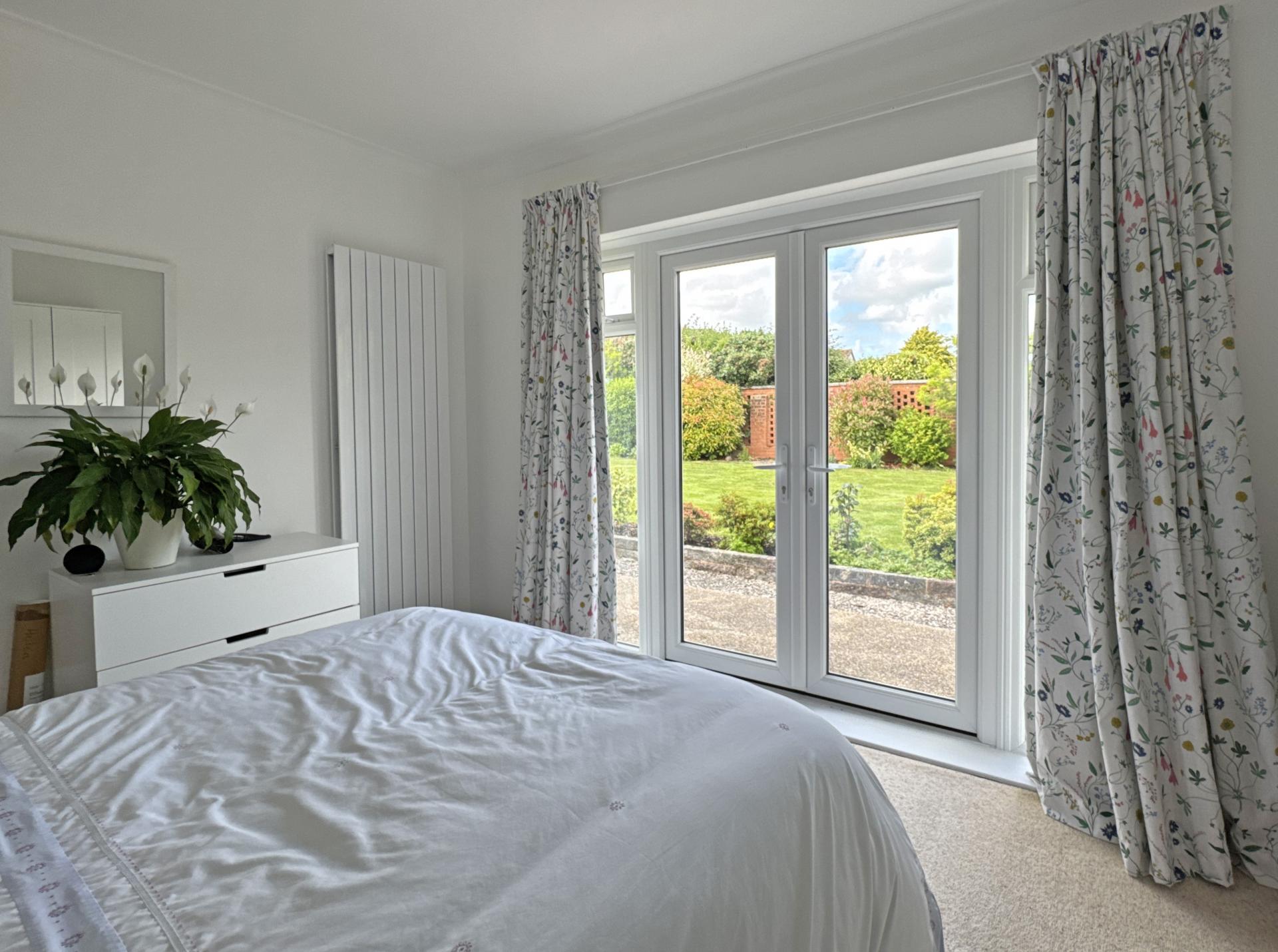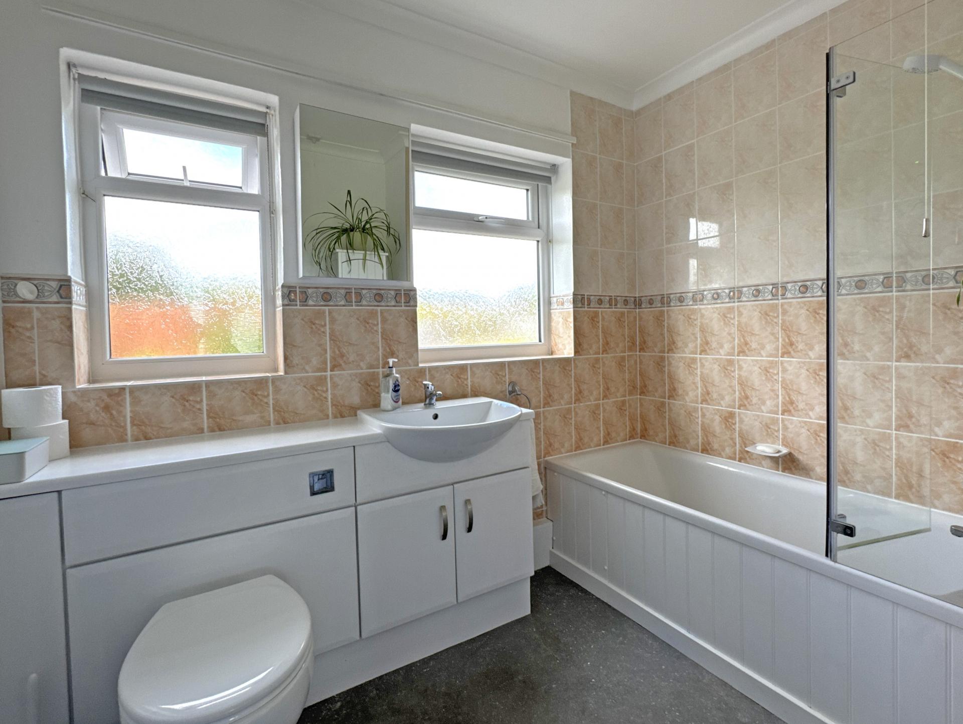 A large main bedroom has the south facing aspect to the front and a fitted wardrobe. There is a second double bedroom with patio doors opening into the rear garden and lastly, a bathroom fitted with a modern white, suite with shower over the bath and fitted storage.