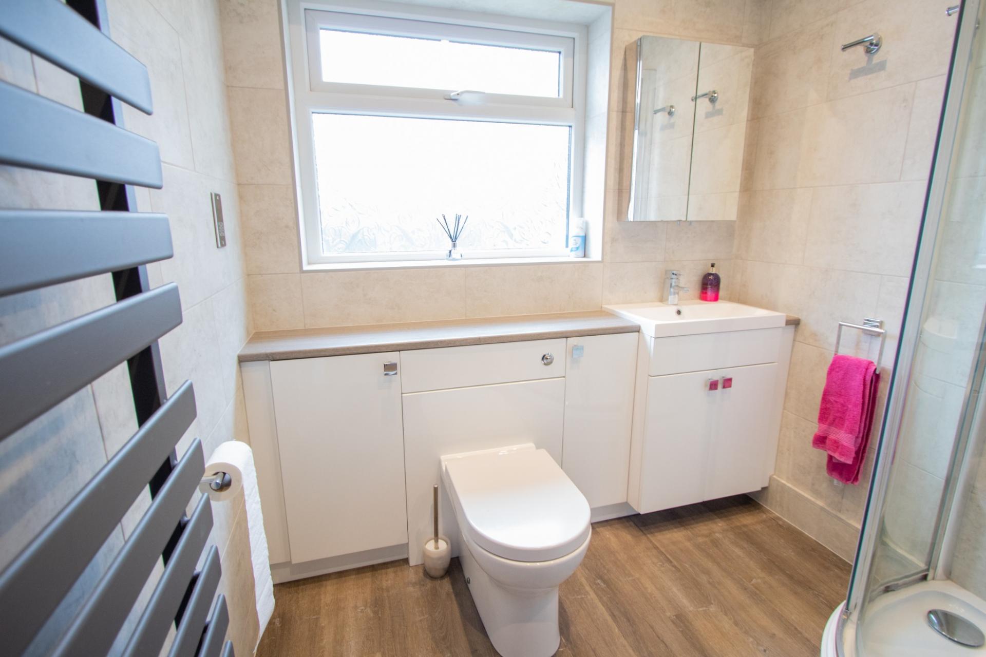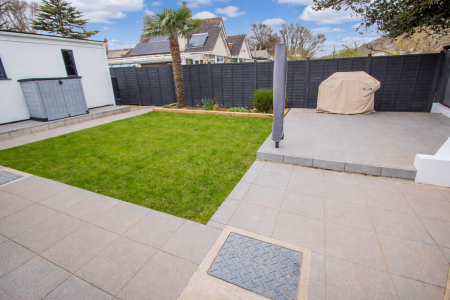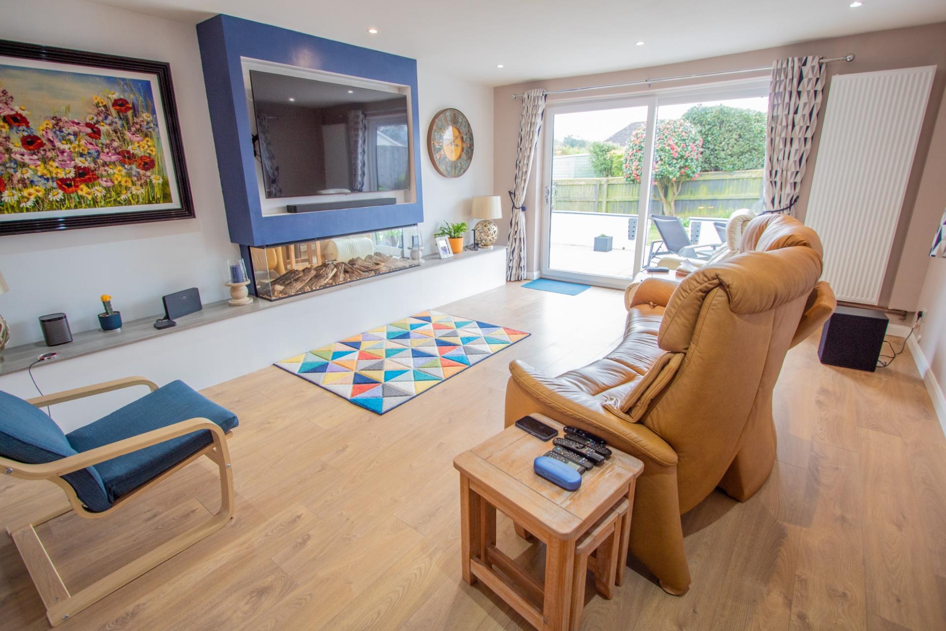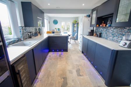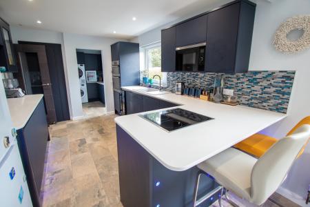 The accommodation comprises; a spacious entrance hallway with laminate flooring, 2 double bedrooms, a re-fitted cloakroom suite, a lovely re-fitted shower room with fully tiled walls and a vanity unit. The living room is a spacious room with a feature media wall, electric fire and patio doors into the garden. The luxury kitchen/dining room has been beautifully re-fitted with a range of matching wall and base units, including 2 glass doors, wall-mounted display cabinets with lights, granite worktops and breakfast bar, integrated freezer and dishwasher, built-in double oven and induction hob as well as a built-in microwave and a Franke sink. There are lights built into the plinths which are on an auto sensor and the floor is tiled. There are French doors in the dining area which give access to the rear garden. There is a re-fitted utility room with a range of units, one houses the boiler.