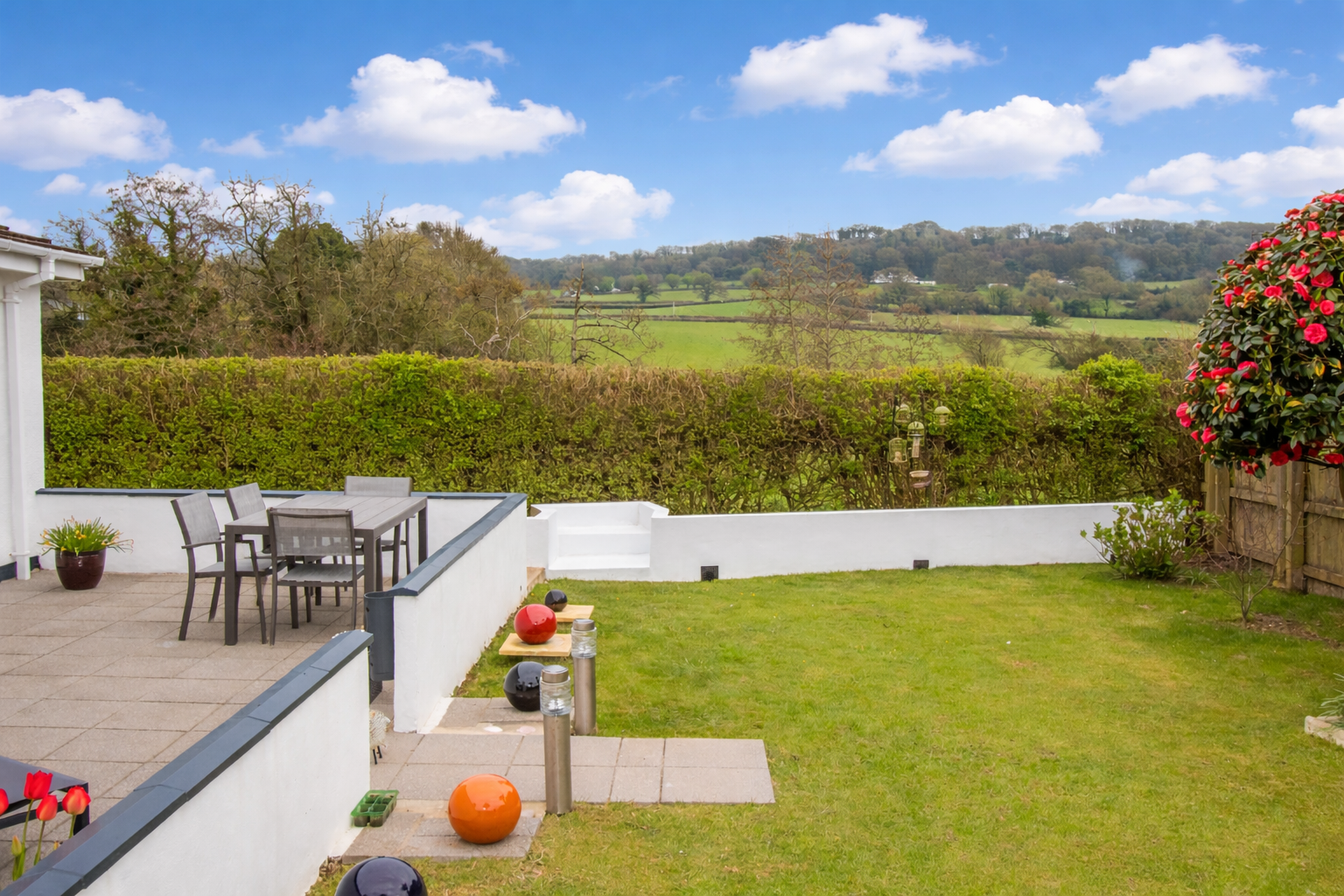 To the side, a driveway leads to the double garage with an up-and-over door, a pedestrian gate leads to the side garden which is attractively landscaped, laid to lawn with a patio and shrubs and enjoying lovely views. To the rear is a pathway with a raised bed, which opens to a large paved with a central lawn and a gate back to the front which is gravelled.