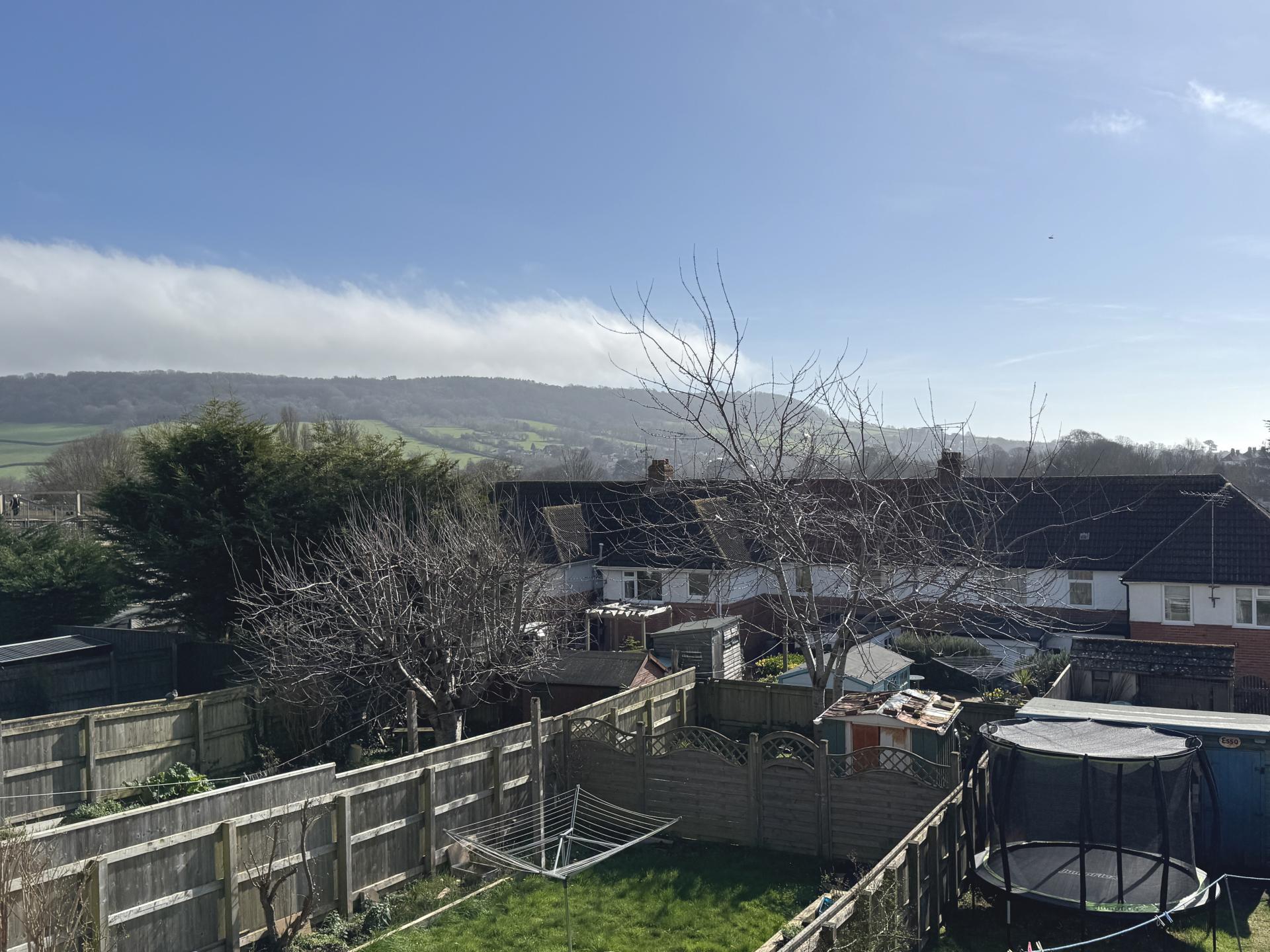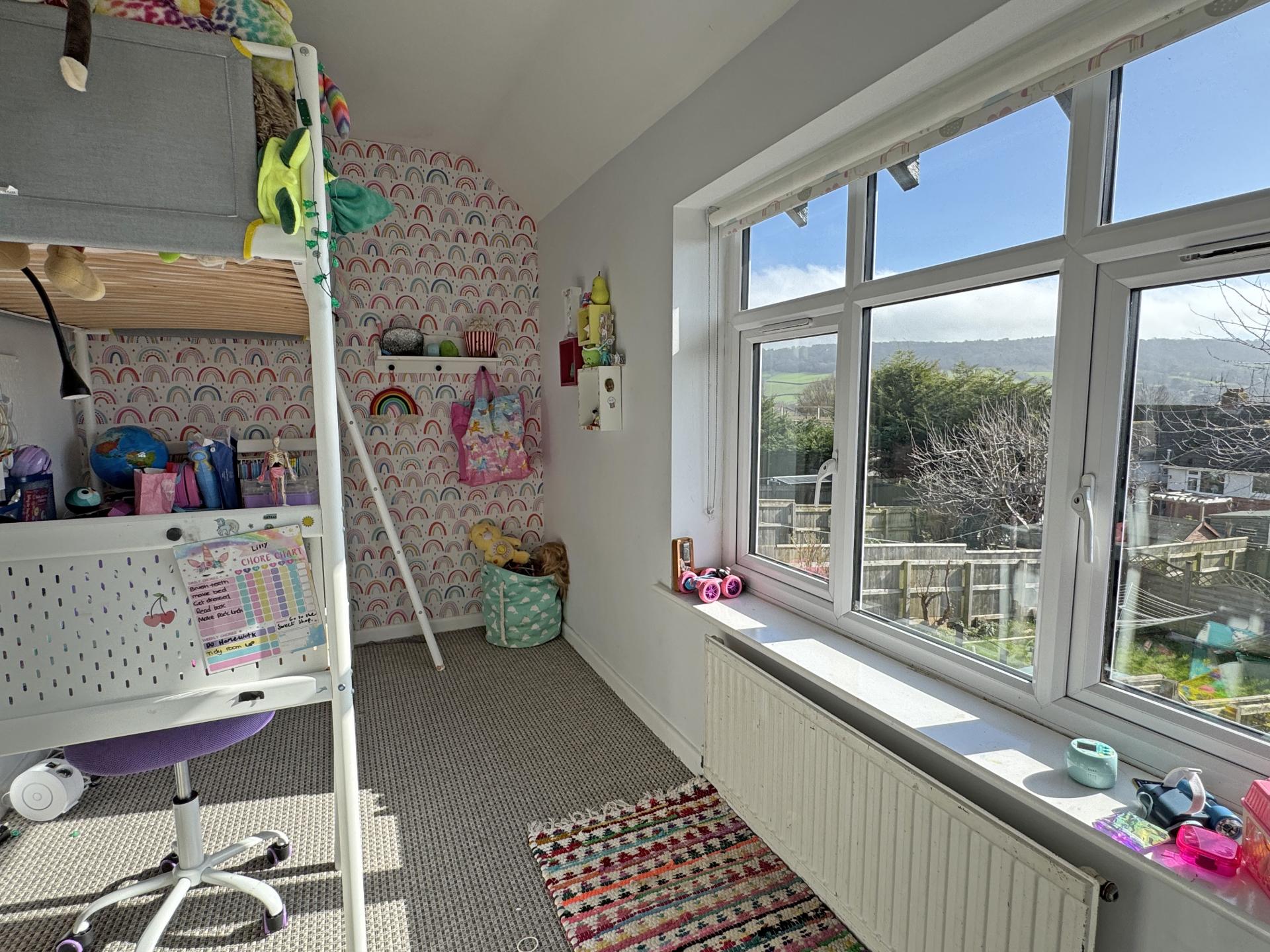 The first floor landing enjoys a southerly aspect and has an airing cupboard off along with access to the roof space, with sliding ladder. There are three bedrooms, the main bedroom being worthy of particular mention, having fitted wardrobes to one wall and featuring part panelled walls. Bedroom two and the landing enjoy a lovely view across the Sid Valley to the surrounding hills.