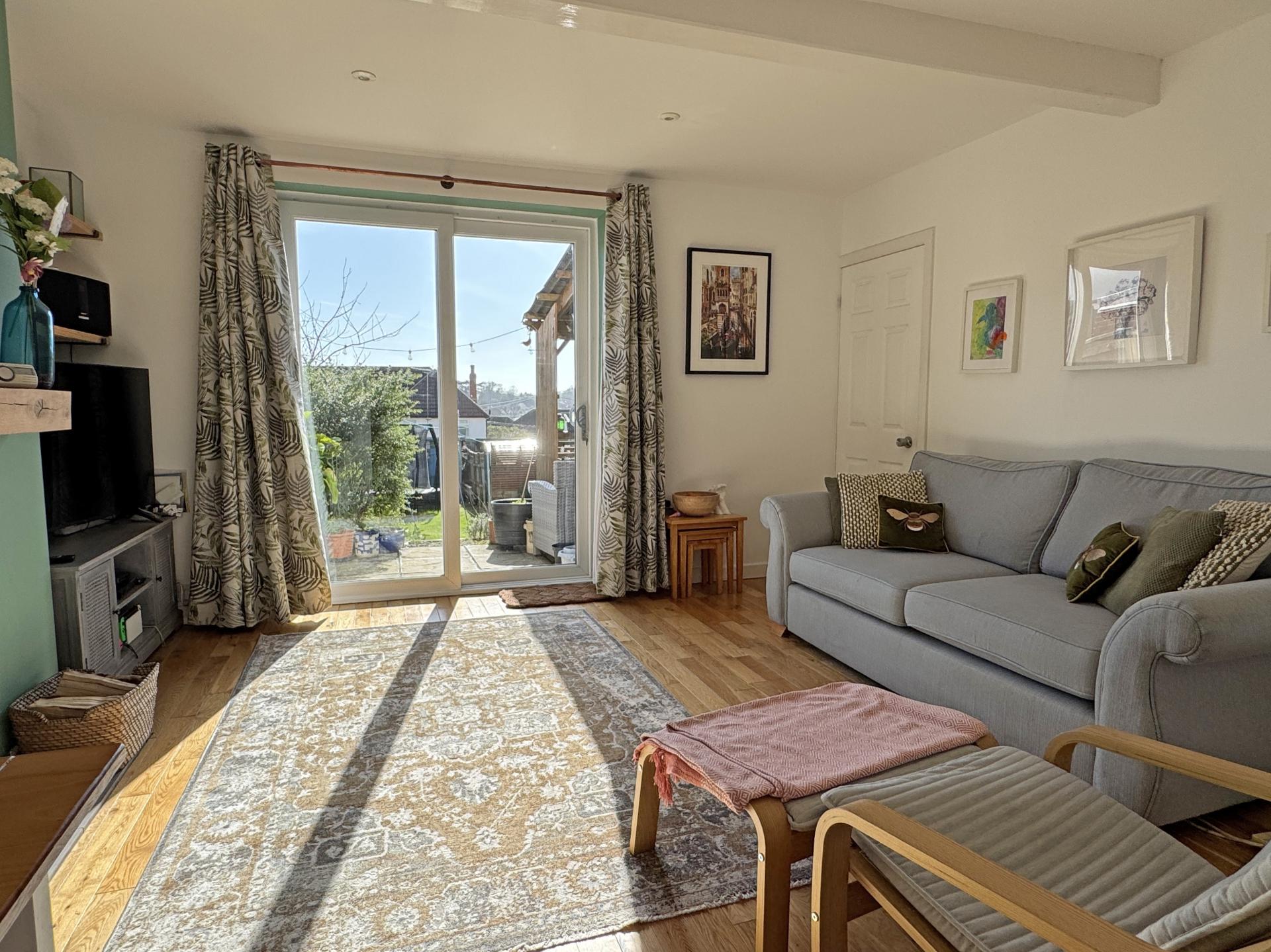On entering the house, the entrance hall has the stairs rising to the upper floor and a half-glazed door opens into the sitting room which enjoys a southerly aspect overlooking the garden and has sliding patio doors. A fireplace with wood burning stove (not in use) gives the room a lovely focal point and there is a useful storage cupboard off. The adjoining kitchen has a range of cupboards, drawers and worksurfaces, all providing storage and there is a built in electric double oven, gas hob, cooker hood and space for a washing machine and fridge. The ground floor bathroom is fitted with a modern white suite comprising a panelled bath with shower attachment, WC, wash basin with vanity cupboard below and has part tiled walls and a chrome heated towel rail.