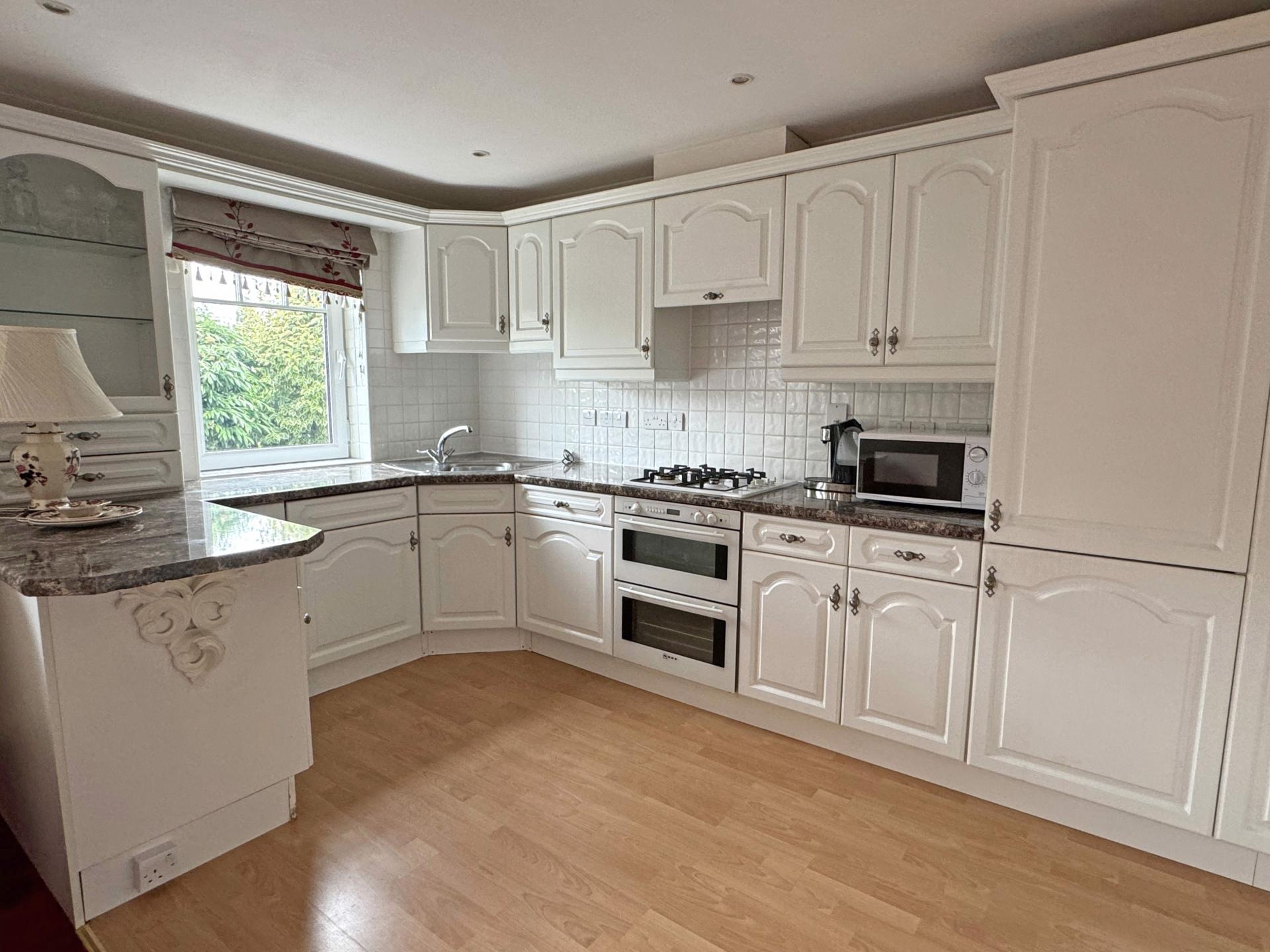 On entering the flat, the entrance hall has a good size storage cupboard which houses the gas fired boiler. An open plan sitting room and kitchen is to the rear of the flat and is well proportioned. The kitchen area is well fitted with a good range of matching units and worksurfaces and there are built in appliances comprising an electric double oven, gas hob, cooker hood, fridge/freezer, dishwasher and washing machine.