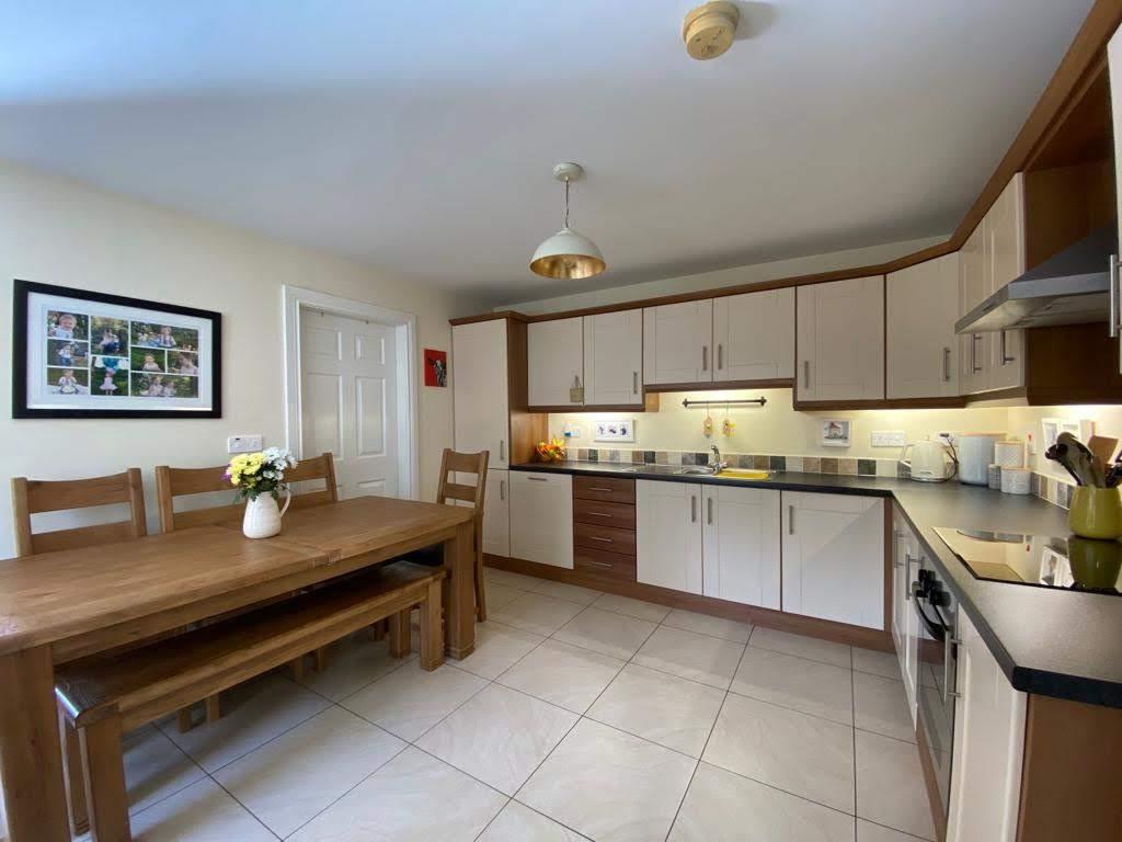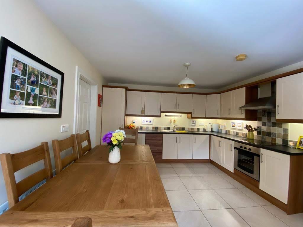 5.79m x 3.73m (19' x 12'3") - Having eye and low level units with concealed lighting under, tiling between units, hob, underoven, stainless steel extractor hood, integrated fridge / freezer and dishwasher, ample dining space, tiled floor, open plan to Sunroom.