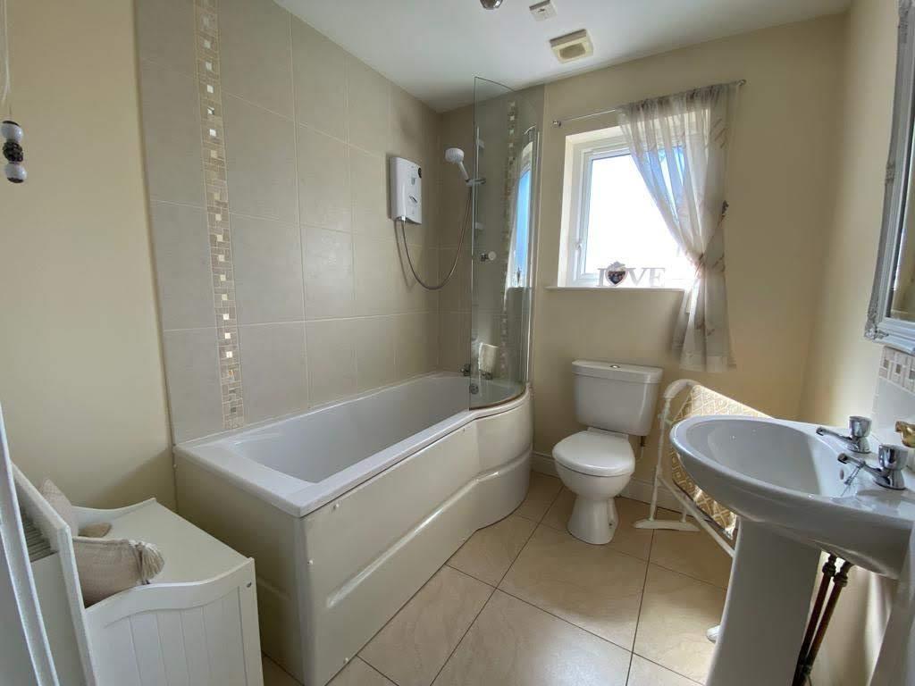 Comprising bath with electric shower over and tiling around, shower screen, whb and wc, tiled floor.