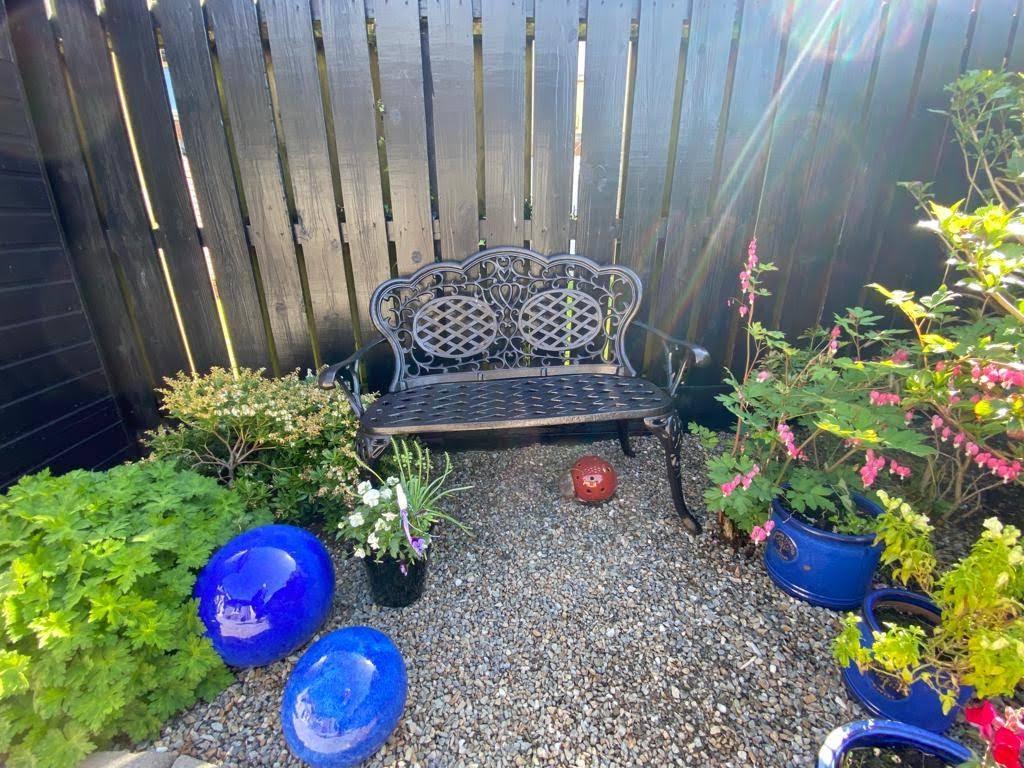 Paved yard to rear with flower border and enclosed by fence and gate.