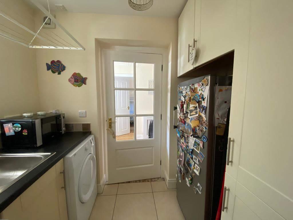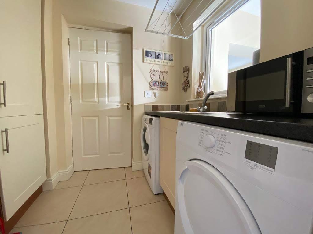 Having range of units, single drainer stainless steel sink unit with mixer taps, plumbed for washing machine, space for tumble dryer, tiled floor.