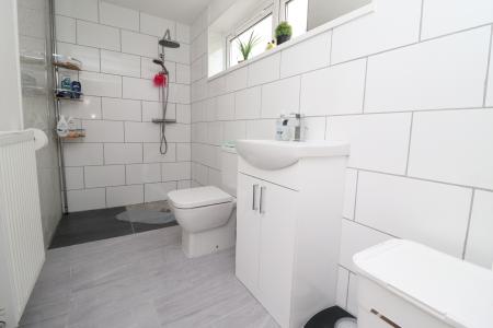 WET ROOM fitted with a three piece suite comprising of wet room shower, close coupled WC and wash hand basin in a vanity unit, part tiled walls, tiled flooring, radiator and double glazed window to the side aspect.