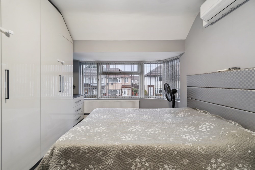 Upstairs, the first floor offers four bedrooms of varying sizes, making the layout ideal for families, home working or guest accommodation. The principal bedroom is a generous double with a curved bay window, while the remaining bedrooms are well proportioned and served by a centrally located bathroom. The layout allows for practical separation of sleeping accommodation, enhancing privacy and functionality.