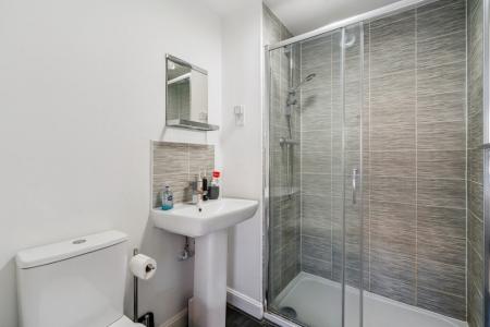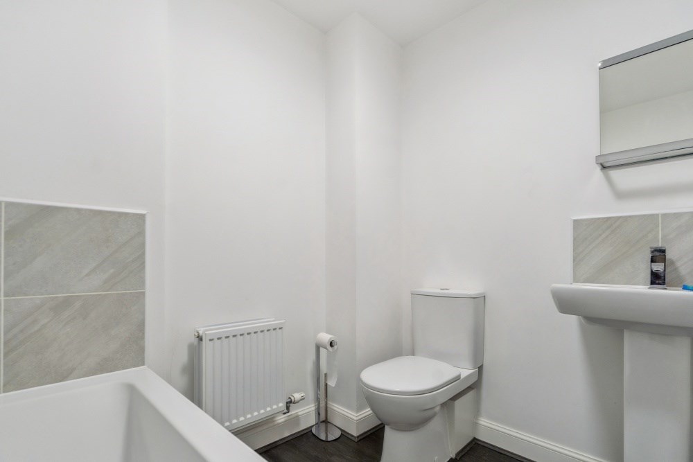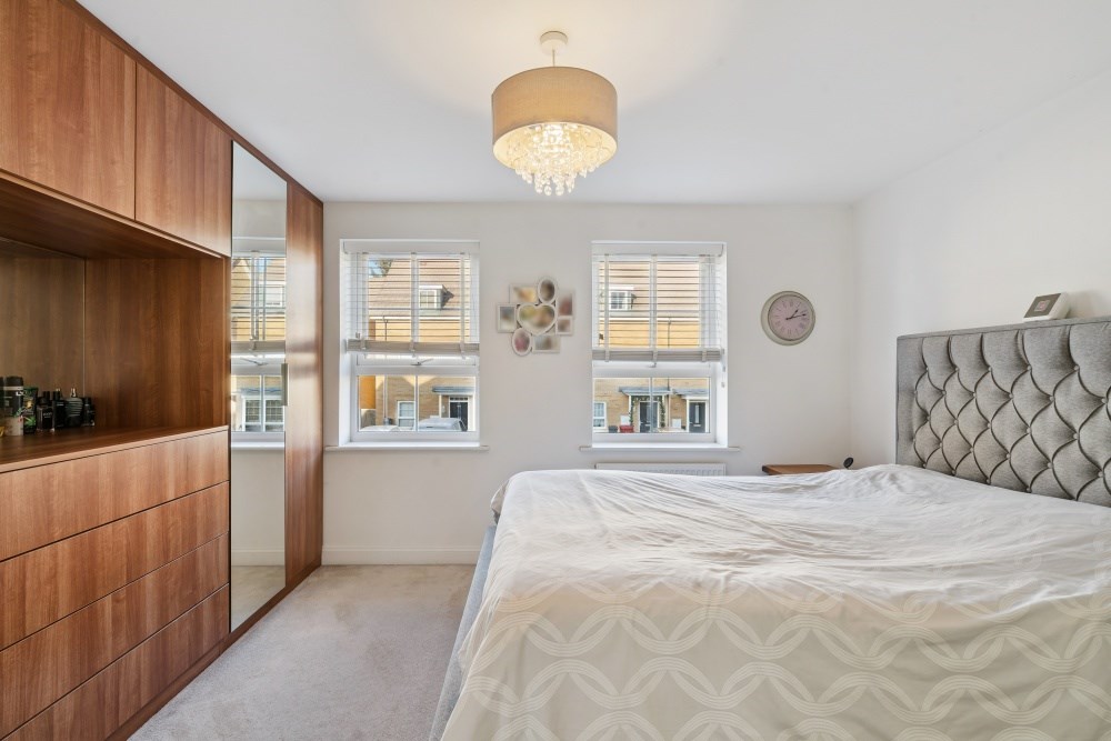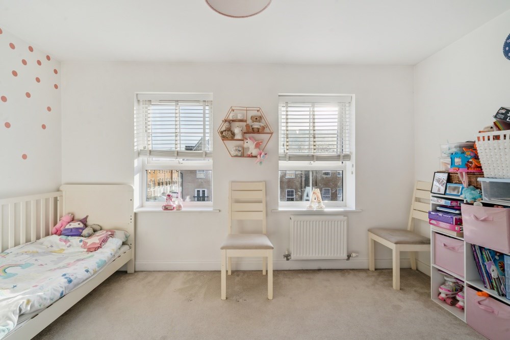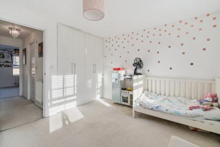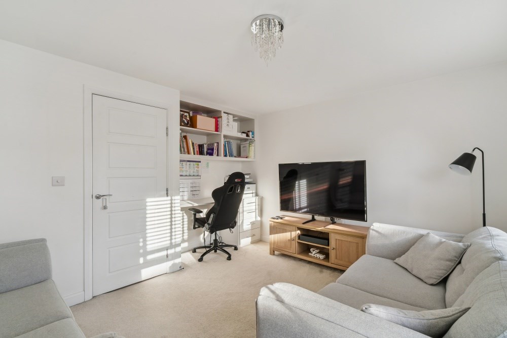 The first floor features a generous bedroom positioned at the front of the property, alongside a second large room that can serve as either a sitting room or an additional bedroom depending on lifestyle needs. A well-appointed family bathroom sits centrally on this level, providing convenience for modern family life. Three of the bedrooms within the property are fitted with built-in wardrobes, offering excellent storage and maintaining the sleek, modern feel of the interior.