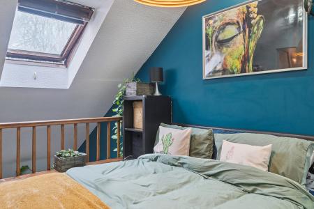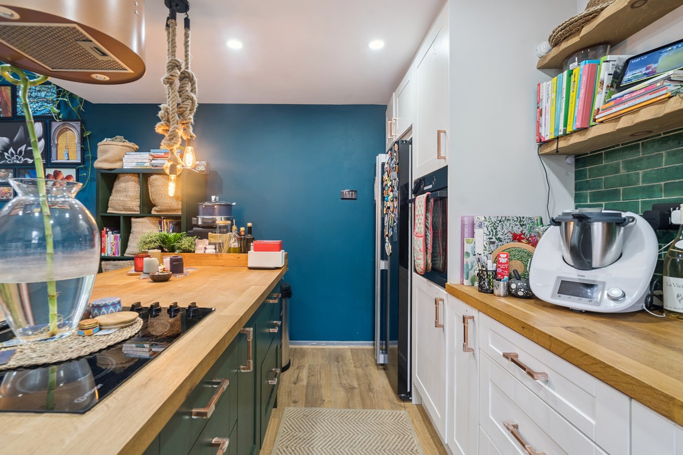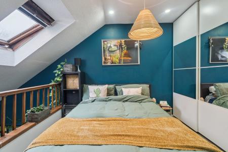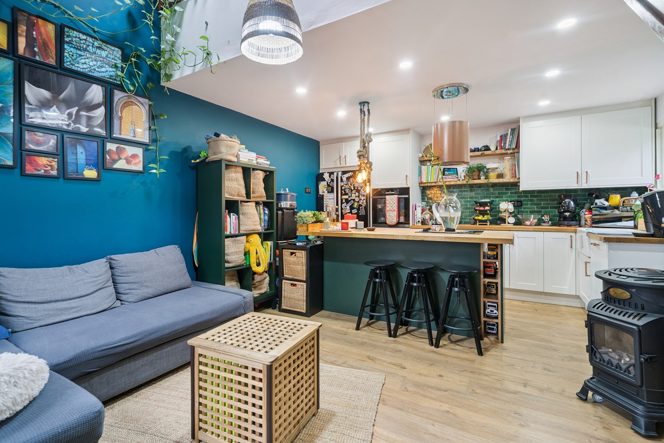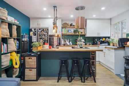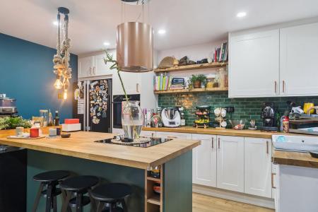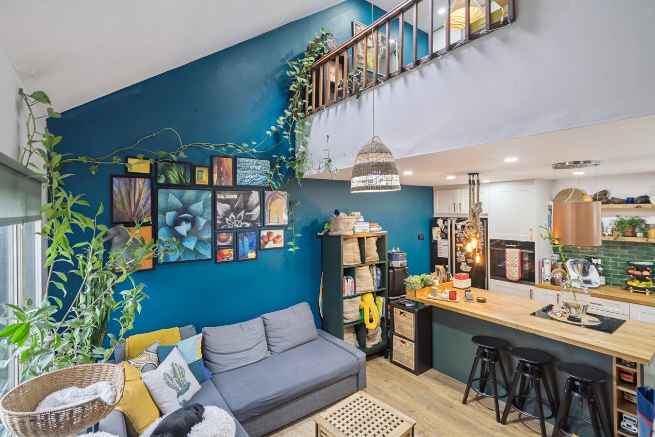 The stylish interior features an open-plan living and kitchen area, creating a warm and inviting atmosphere upon entry, with views extending up to the mezzanine-style bedroom complete with a Velux window. The kitchen is finished to a high standard and benefits from integrated appliances, a ceramic butler-style sink, and a central island with breakfast bar perfect for casual dining and entertaining alongside ample storage.