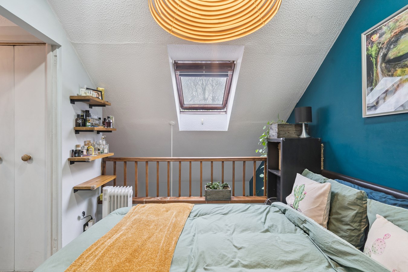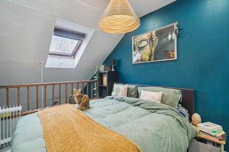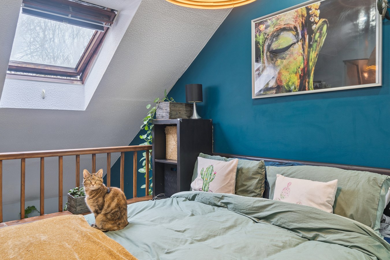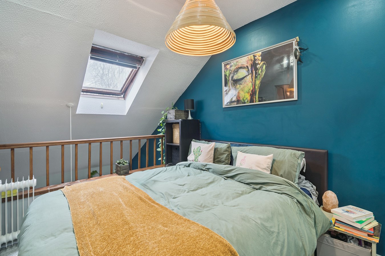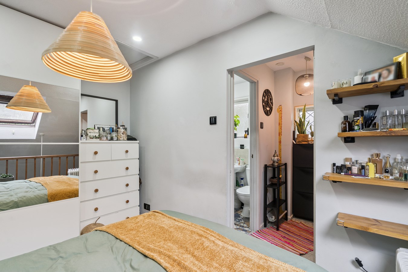 The stylish interior features an open-plan living and kitchen area, creating a warm and inviting atmosphere upon entry, with views extending up to the mezzanine-style bedroom complete with a Velux window. The kitchen is finished to a high standard and benefits from integrated appliances, a ceramic butler-style sink, and a central island with breakfast bar perfect for casual dining and entertaining alongside ample storage.