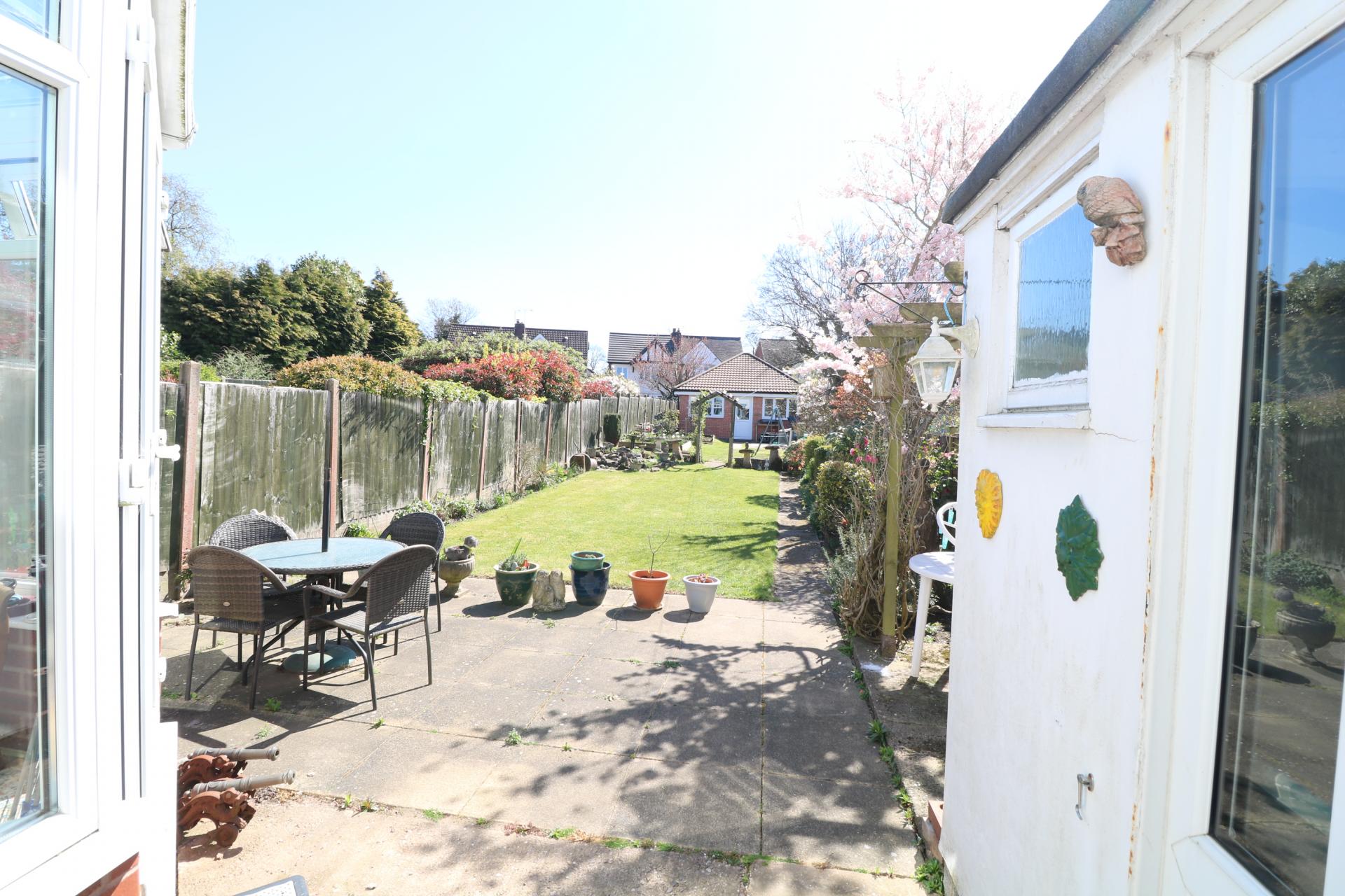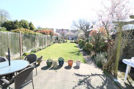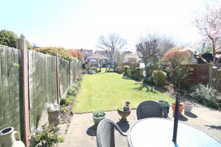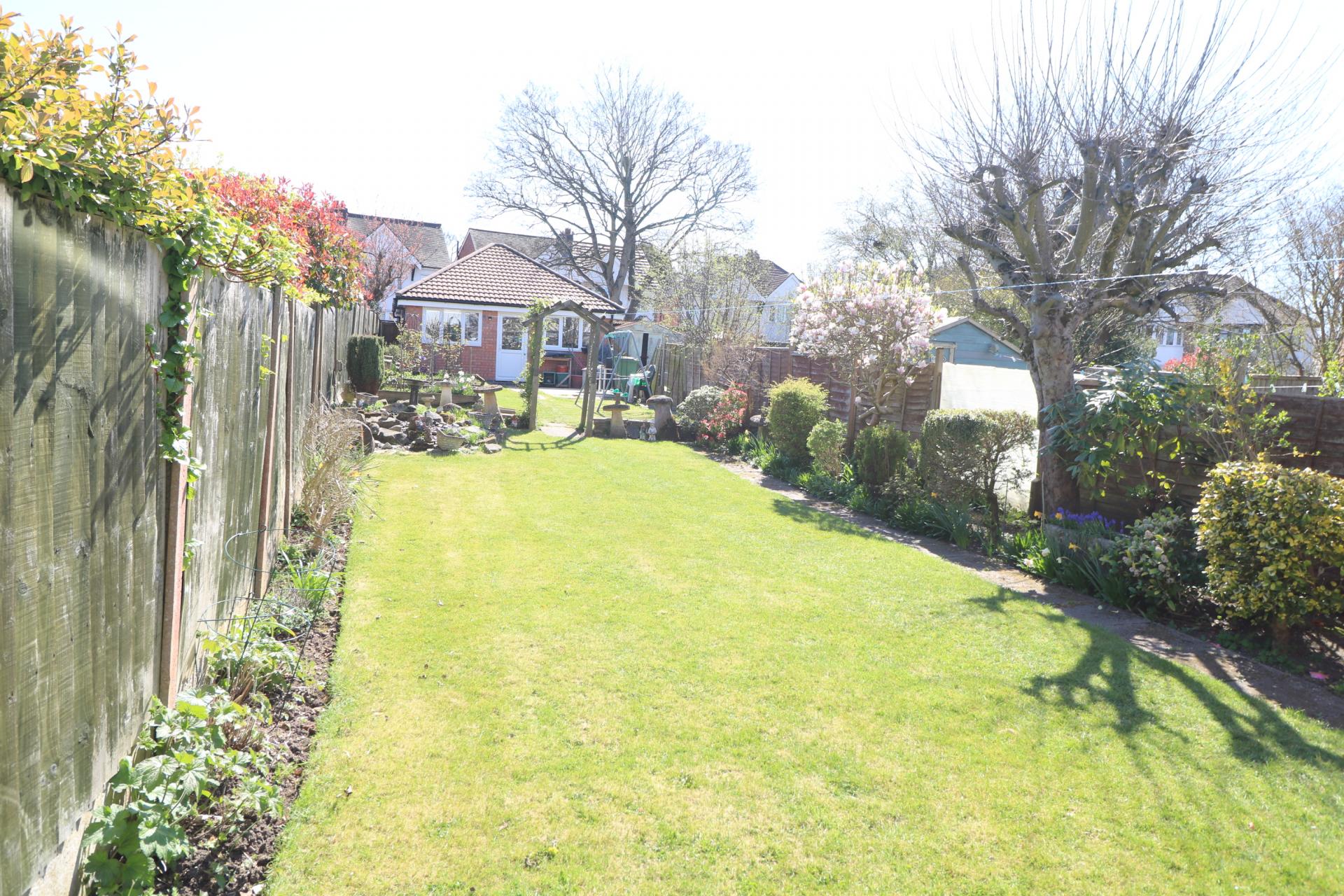 REAR Feature large, enclosed garden with patio area, mainly laid to lawn, herbaceous borders, flower beds, trees, shrubs and rockery.
