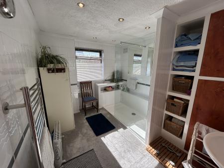 SHOWER ROOM 10' 8" x 8' 5" (3.261m x 2.574m) Large walk-in shower cubicle, inset vanity sink unit, airing cupboard, tiled elevations.