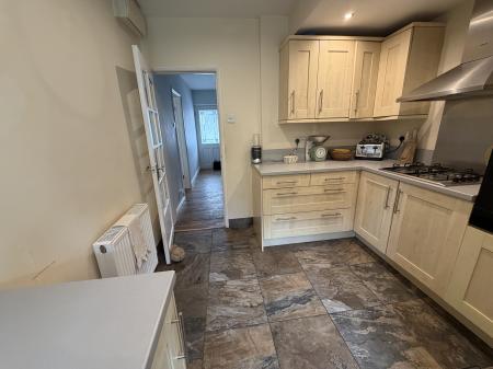 KITCHEN Window to rear. Gas hob, electric double oven, one and a half sink and drainer, integrated dishwasher and fridge. Space for washing machine. Spotlights and a tiled floor.
