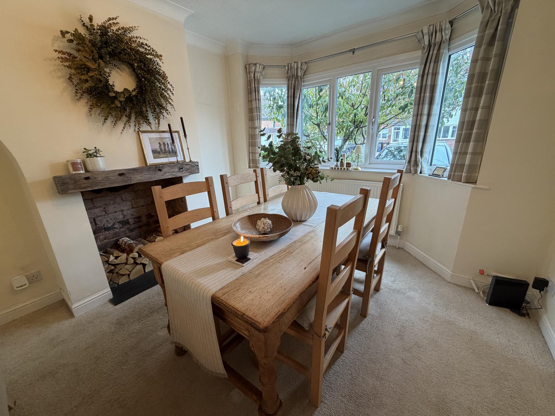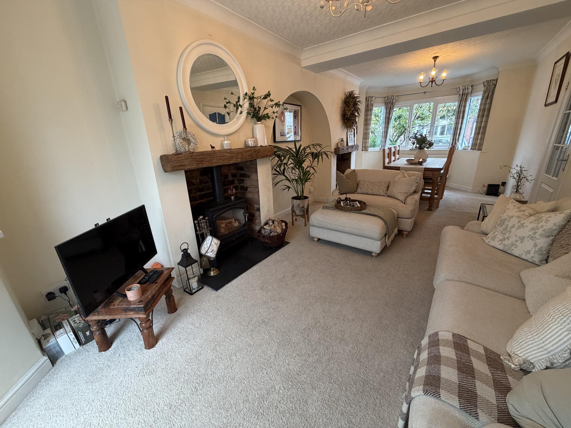 LOUNGE/DINER An attractive, spacious through lounge/diner. Bay window to front and patio doors to rear to Conservatory. Log burner and log storage feature fireplace, both with attractive wooden shelves above.