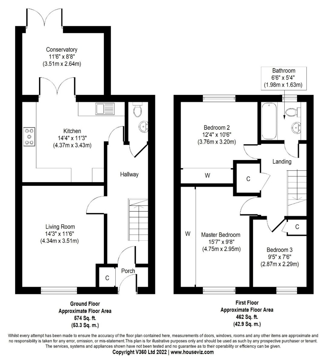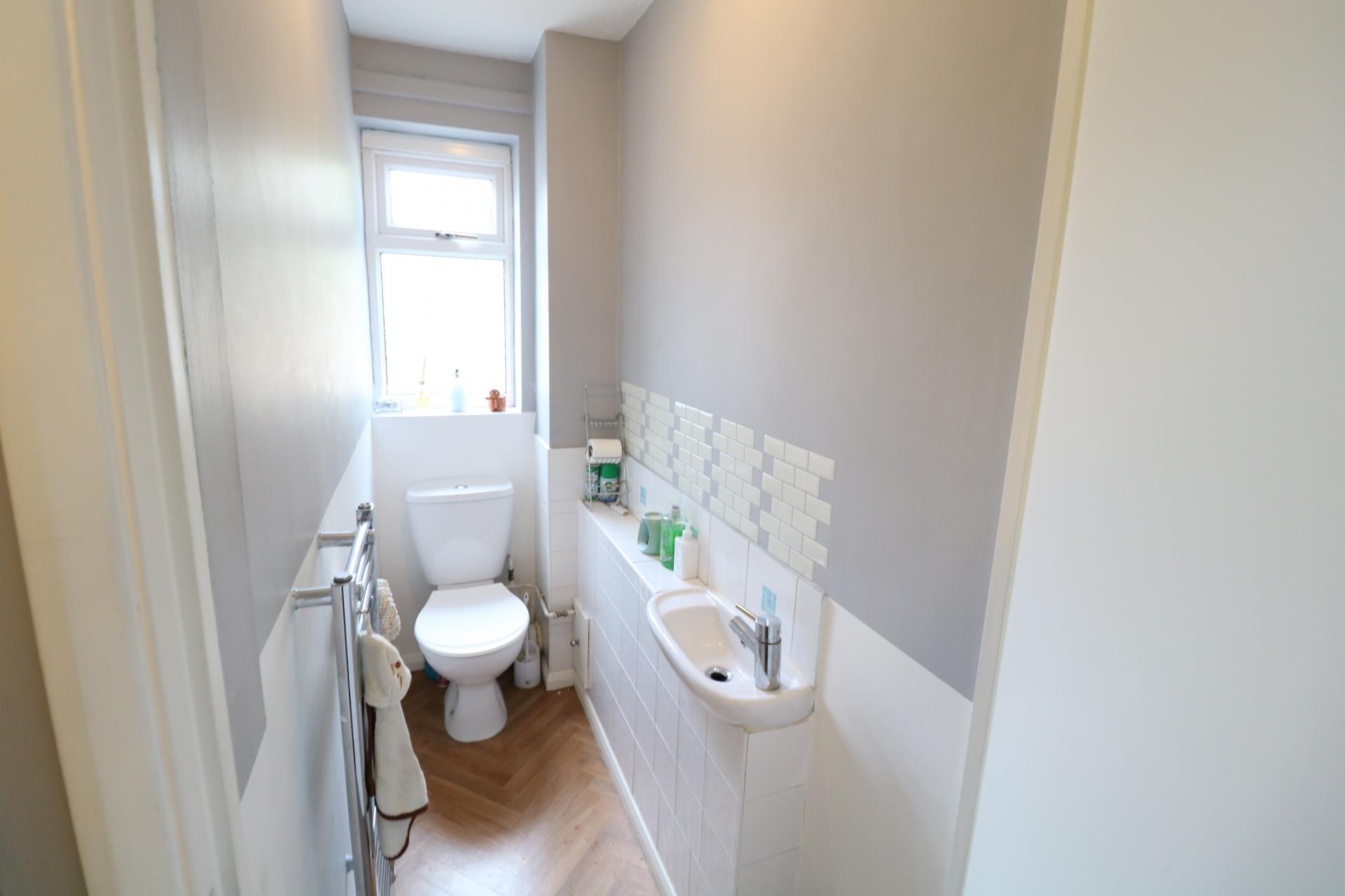 BATHROOM/WC White three piece suite comprising of bath with shower over, wash basin and low level flush wc. Tiled elevations and flooring.