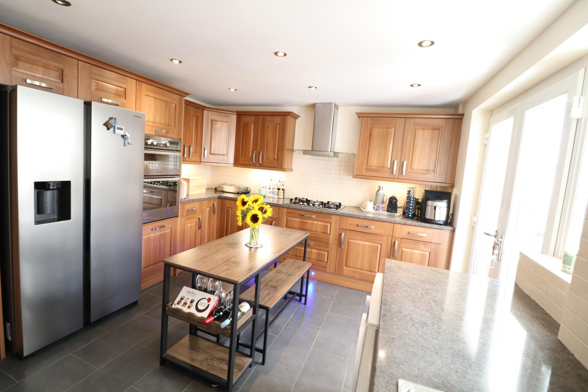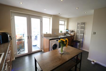 KITCHEN 14' 4" x 11' 3" (4.37m x 3.43m) With fully fitted base and wall cupboard units, gas hob, extractor hood, split level oven and grill and stainless steel sink unit. Part tiled elevations and floor tiling.