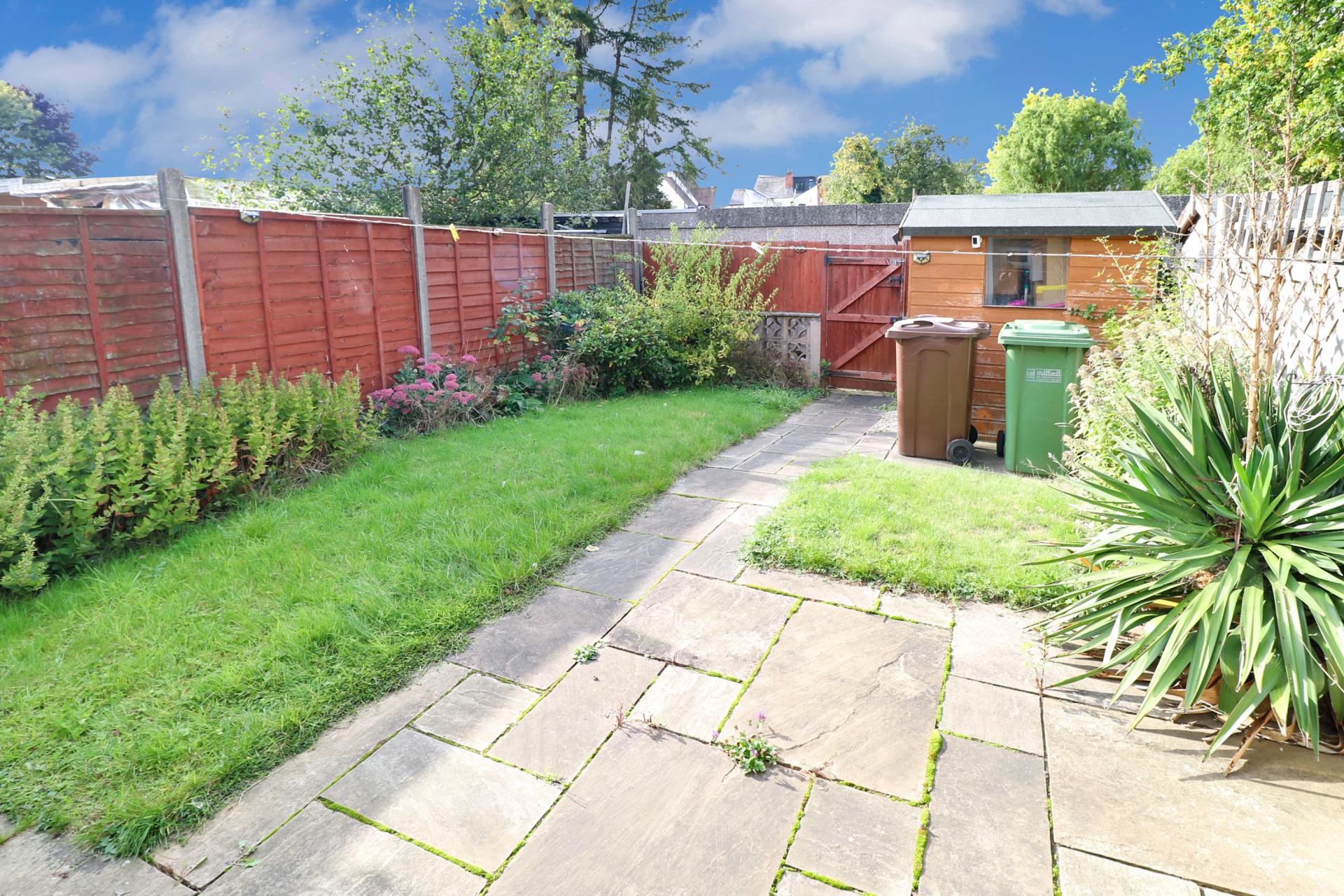REAR Fence enclosed lawned garden with shrub borders, paved patio area.