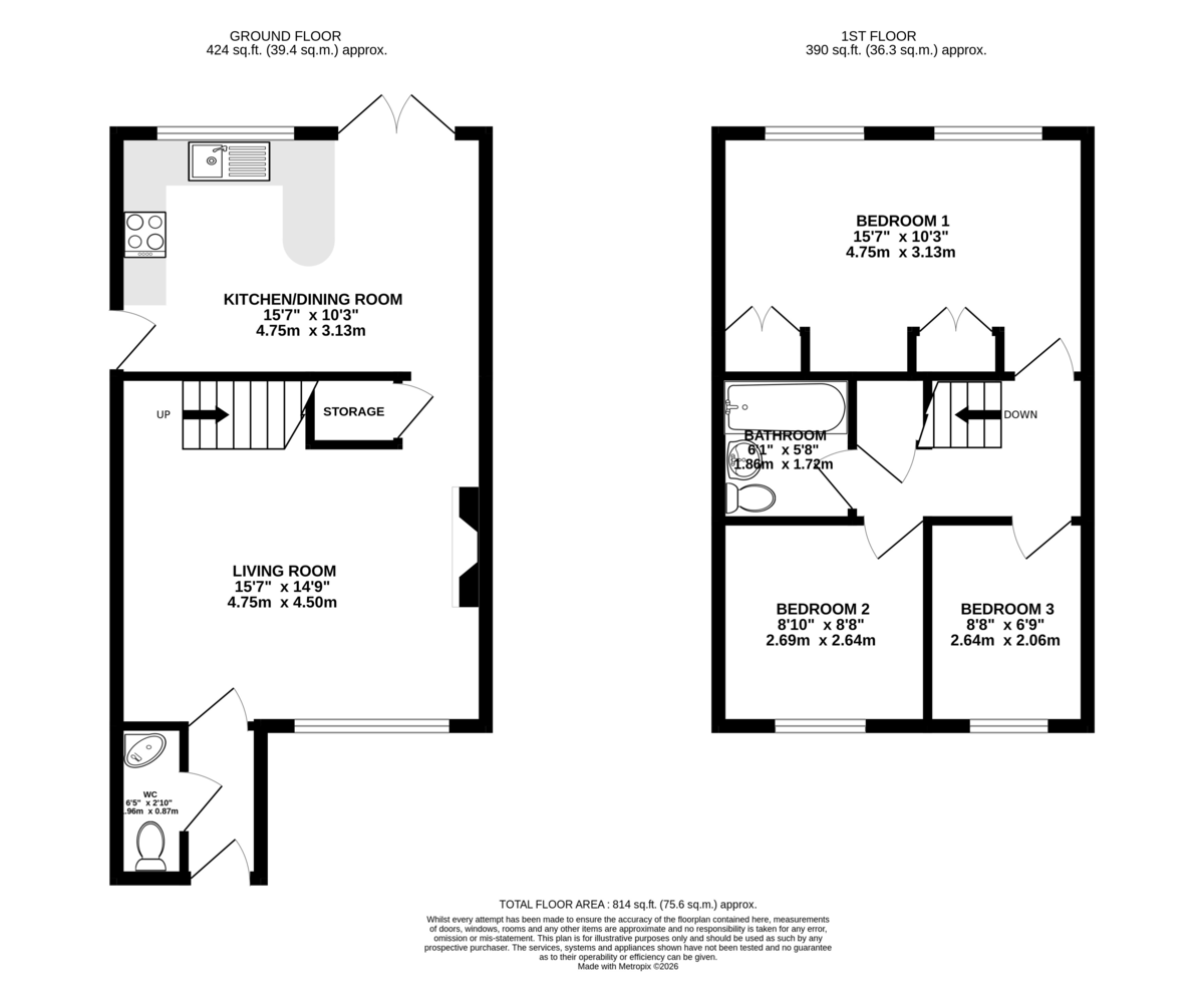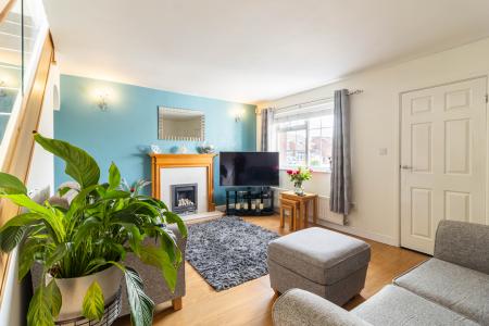 LOUNGE Window to front, stairs off to the first floor, door to kitchen, electric fire and fireplace and a storage cupboard.