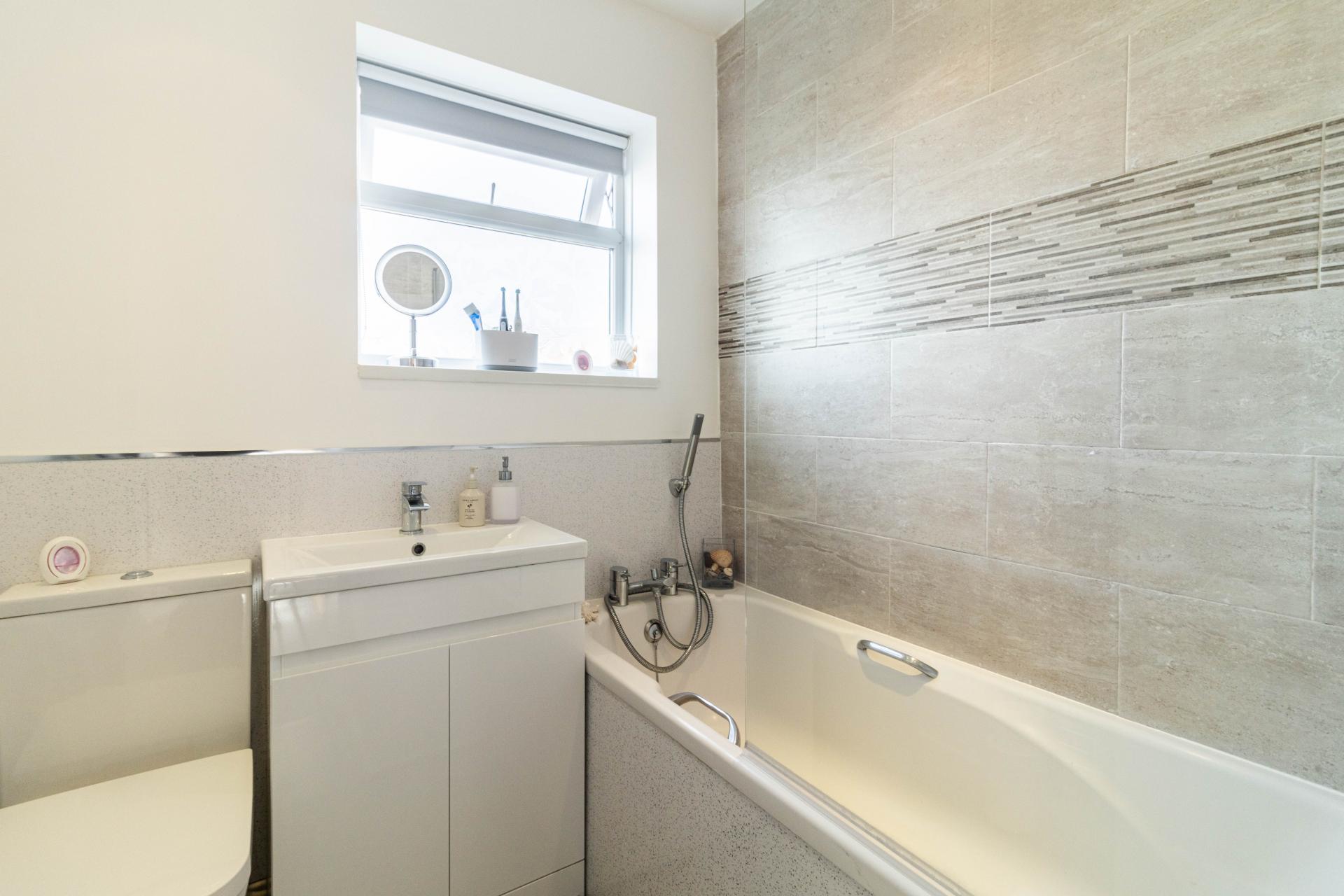 BATHROOM Window to side, laminate flooring, bath with a shower over, partly tiled walls, low level WC, vanity sink and storage unit with heated towel rail.