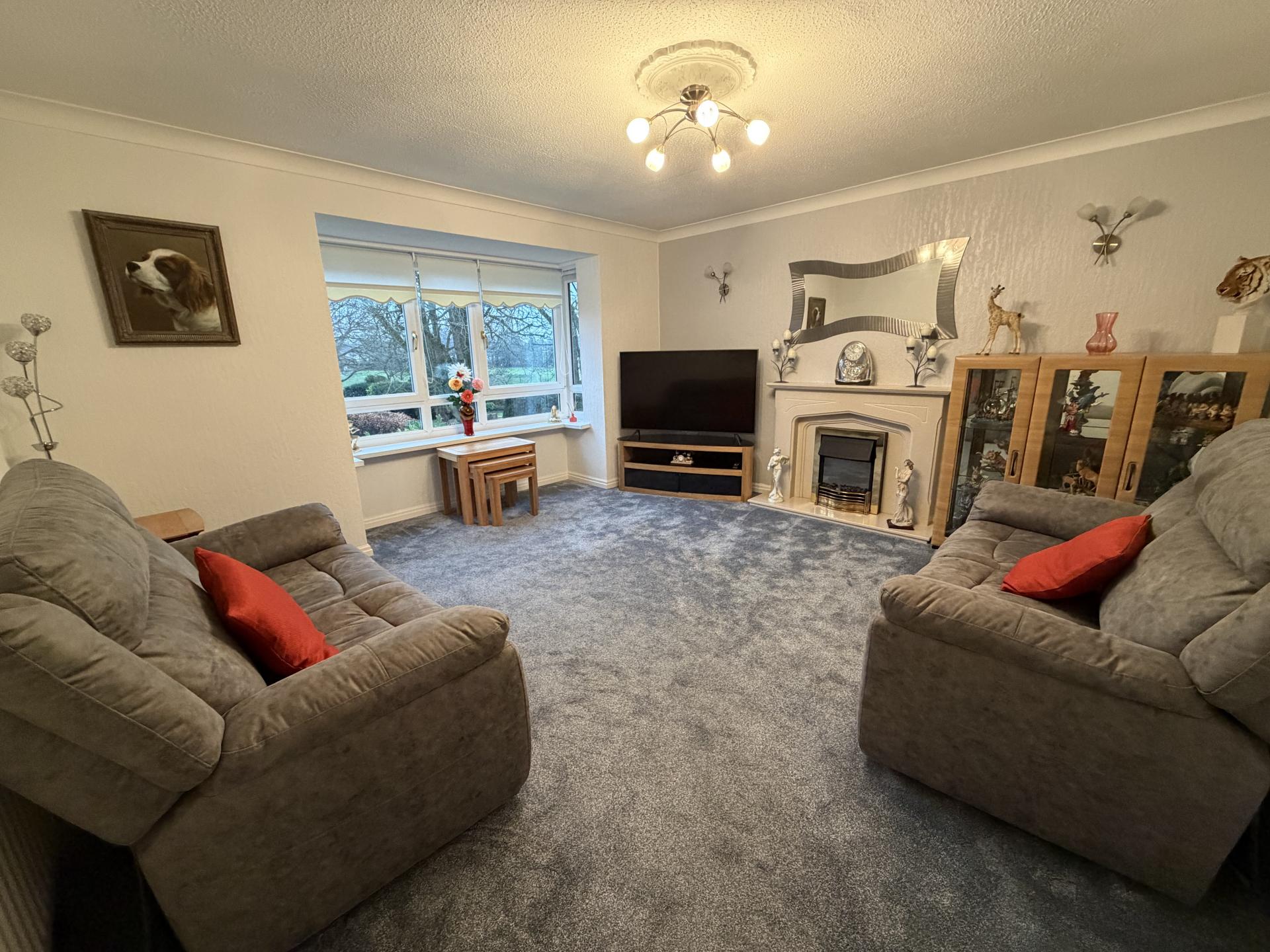 LOUNGE 14' 8" x 14' 0" (4.47m x 4.27m) A beautiful spacious light and airy room with a bay window to rear overlooking the beautiful communal garden and playing fields. Fireplace and electric fire. Wall and ceiling lights.