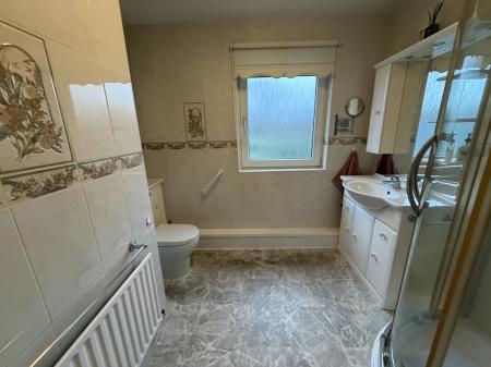 SHOWER ROOM Corner shower cubicle, low level WC, sink with vanity storage cupboards and mirror with shelving.