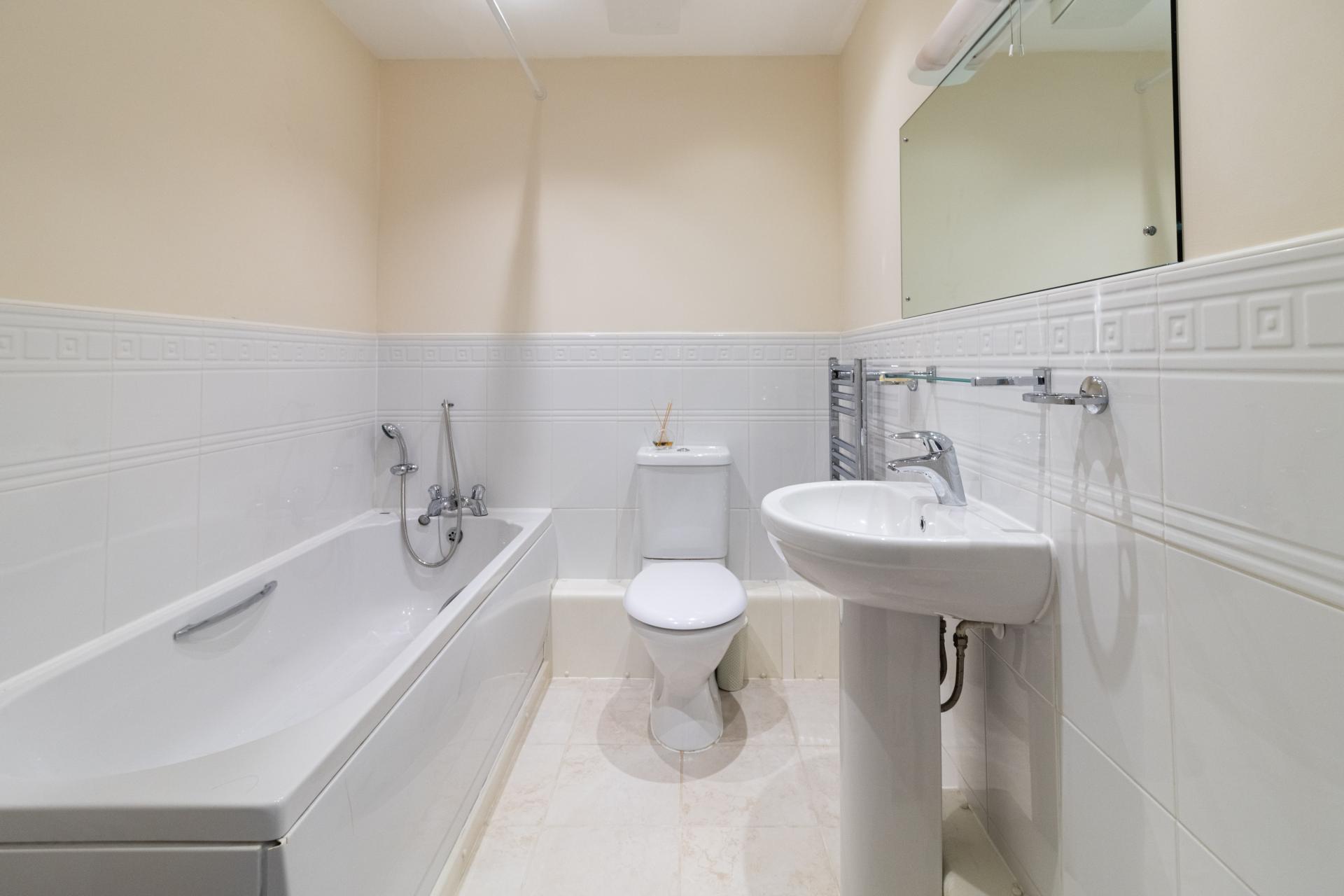 BATHROOM Bath, low level WC, heated towel rail, sink and tiled floor.
