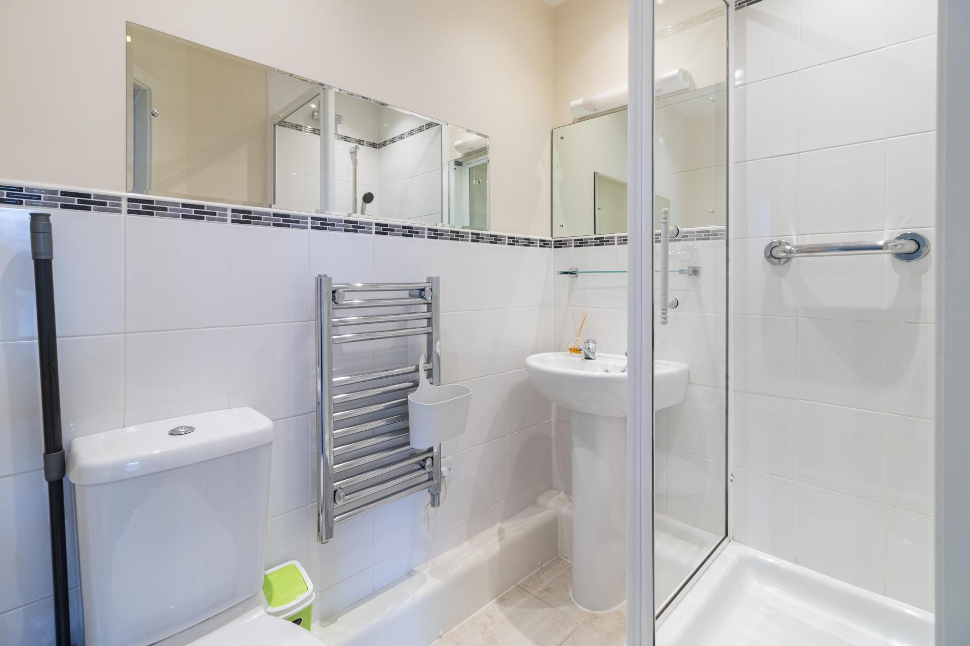 EN-SUITE Corner shower cubicle, heated towel rail, sink, low level WC and a tiled floor.