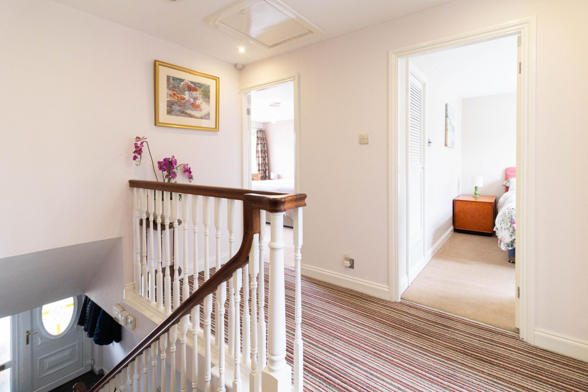 LANDING A spacious landing with a loft hatch and spotlights.