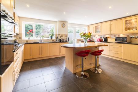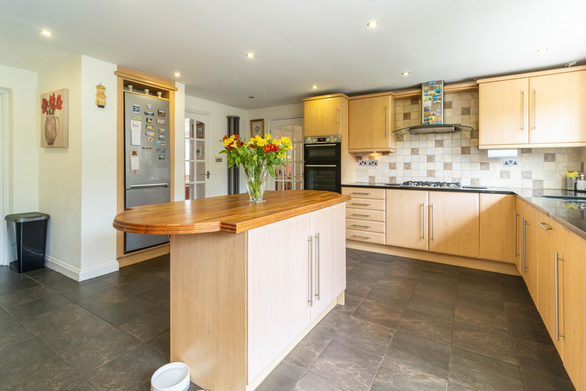 KITCHEN A beautiful extended kitchen window, a window to the rear elevation. Tiled flooring, door to garden, doors to downstairs WC and garage. Island with wooden work surfaces and storage. Gas hob, electric double oven, wine storage, space for a fridge/freezer, integrated washing machine and dishwasher.