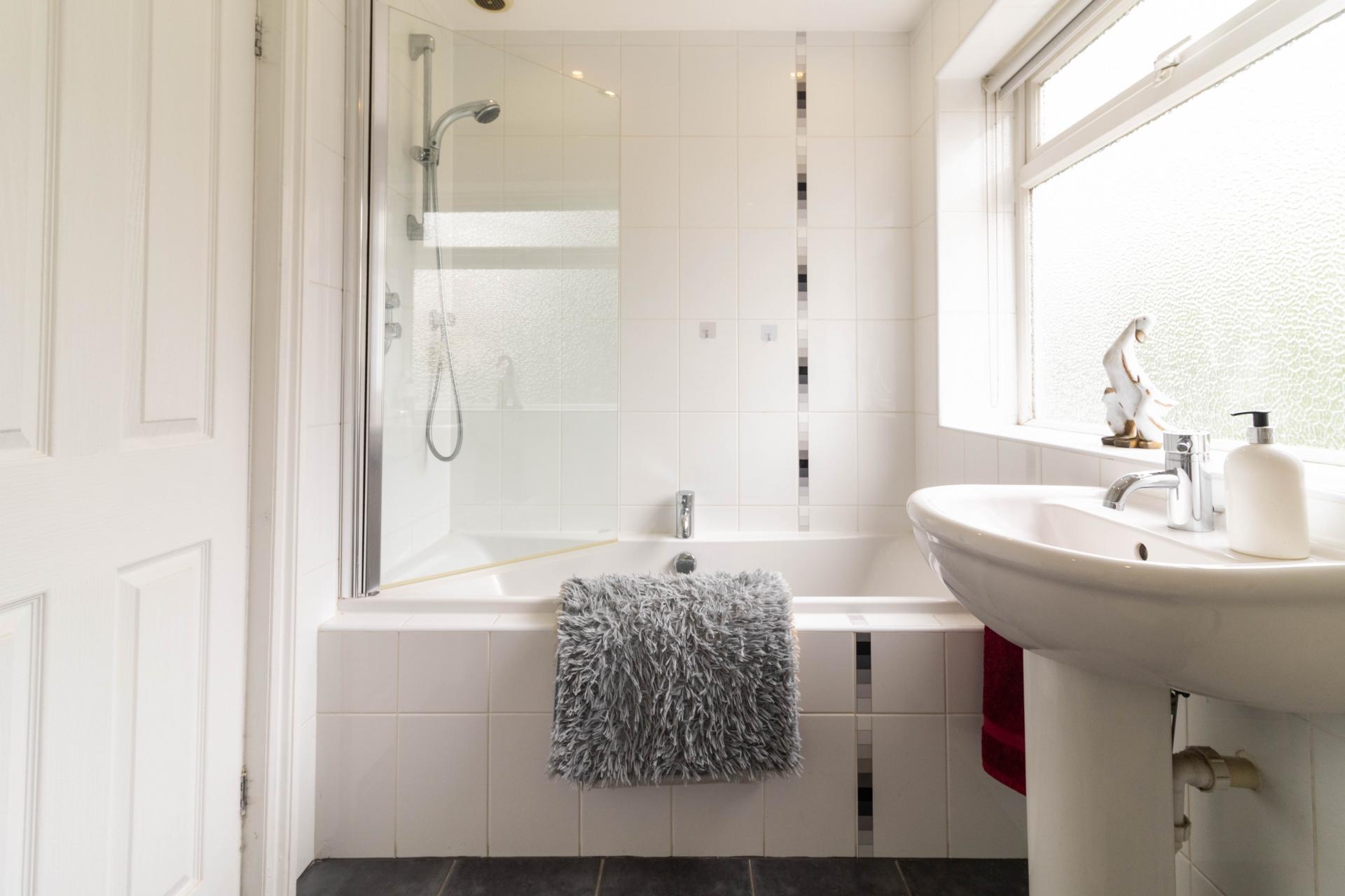 FAMILY BATHROOM Window to the rear elevation. Tiled floors, heated towel rail, low level WC, sink, bath with shower over and spotlights.