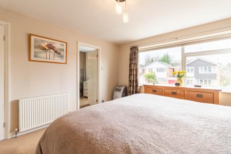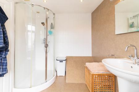 EN-SUITE Tiled flooring, corner shower cubicle, fully tiled walls, low level WC, sink, storage cupboards, heated towel rail and window to front.