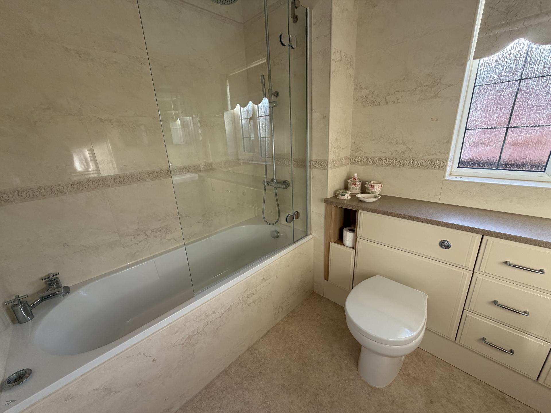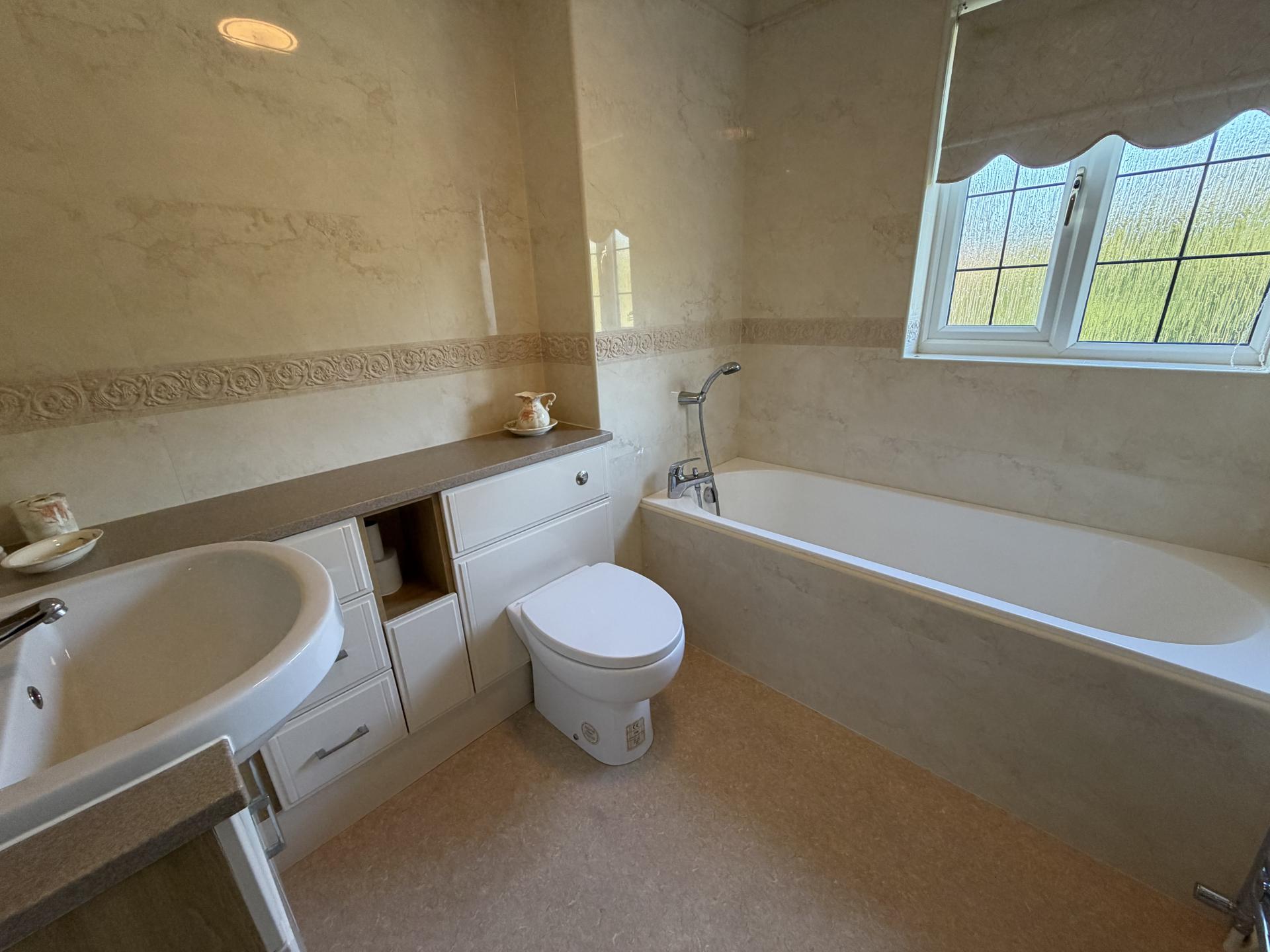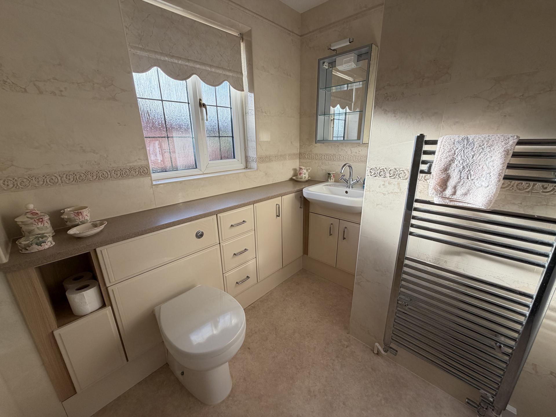 BATHROOM Shower cubicle with shower over, low level WC, vanity sink with fitted storage cupboards. Window to side.