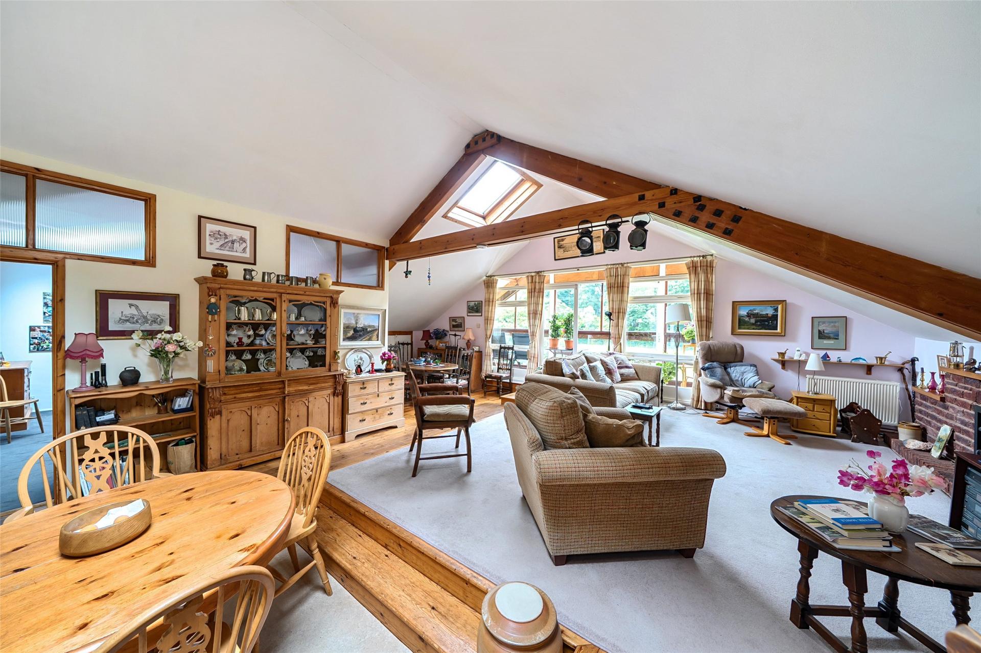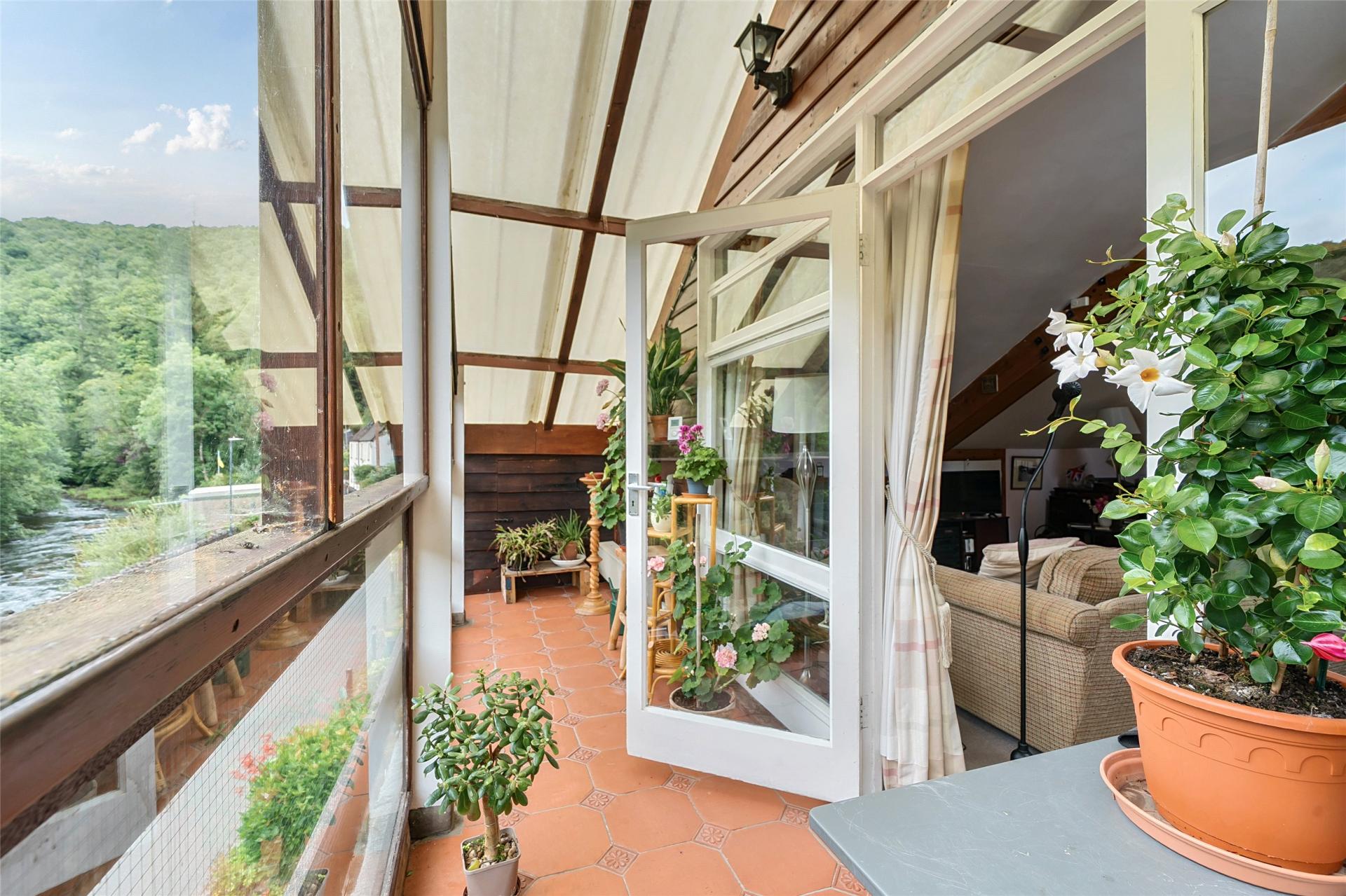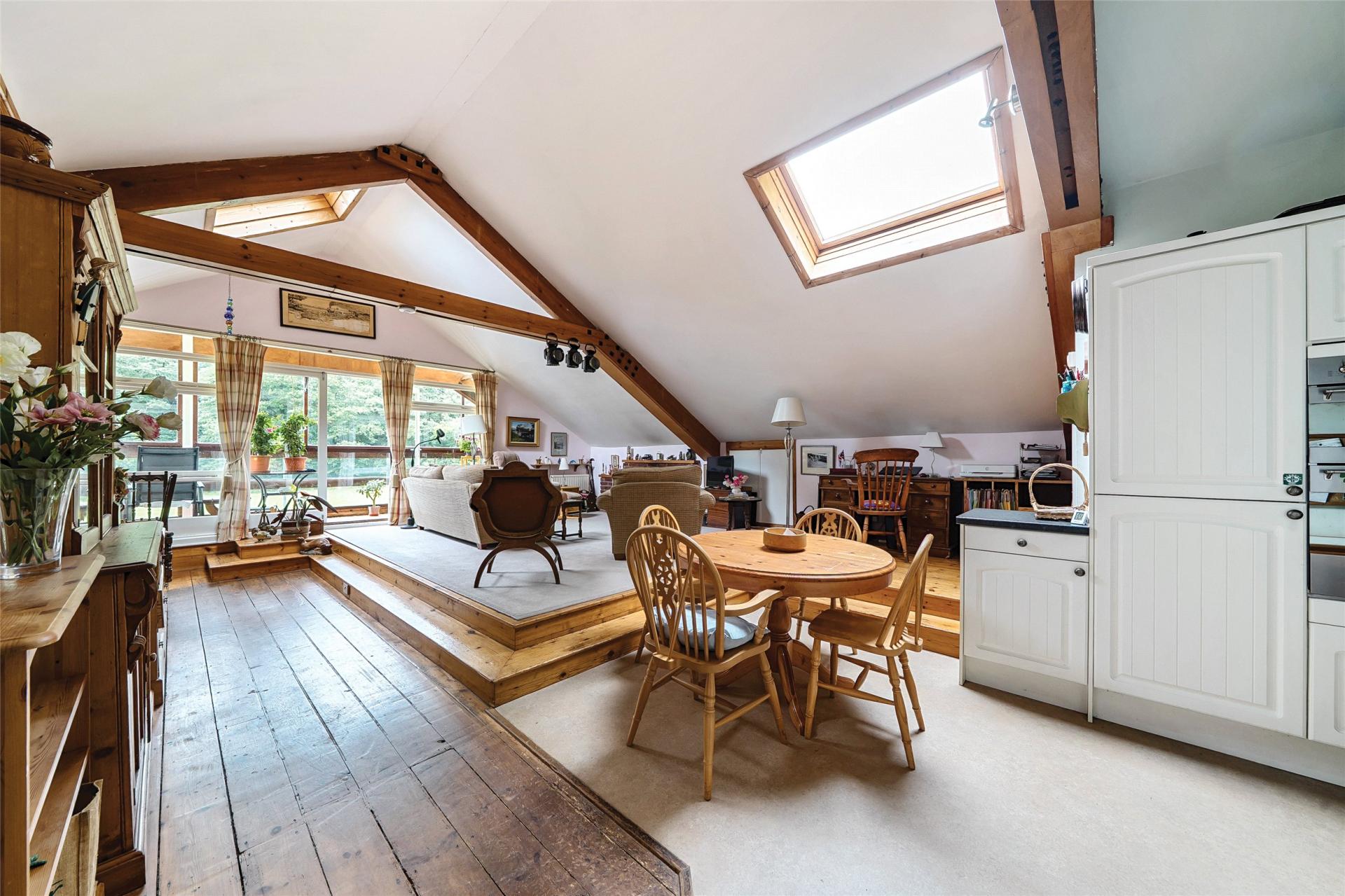 The first floor features a large open-plan apartment with a kitchen, lounge, dining area, bathroom/WC, and two bedrooms. The lounge and dining area open onto a covered veranda with views of the clear waters of the River Barle. The property offers one parking space at the front and two back-to-back spaces on the side. The apartment is equipped with oil-fired radiator central heating and a calor gas fire with a brick surround.