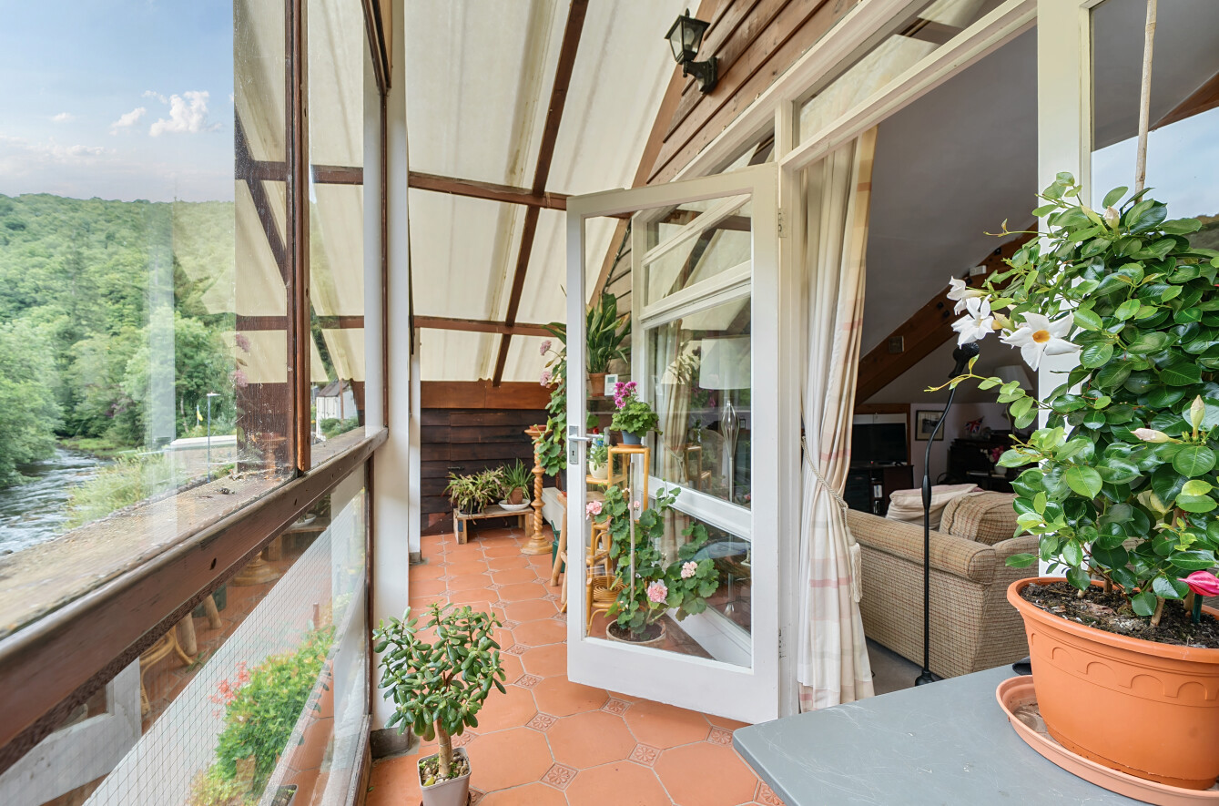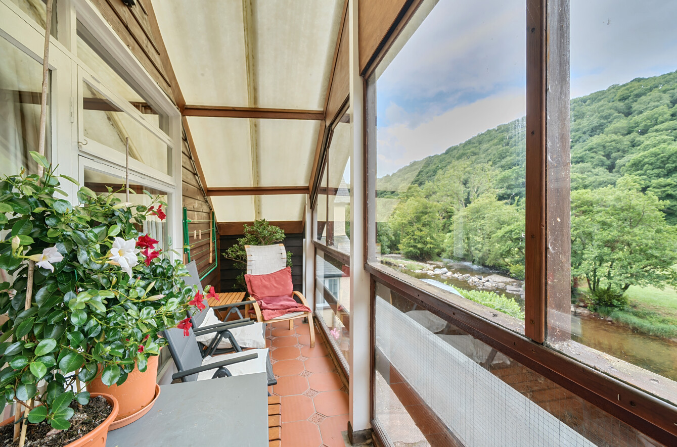 The first floor features a large open-plan apartment with a kitchen, lounge, dining area, bathroom/WC, and two bedrooms. The lounge and dining area open onto a covered veranda with views of the clear waters of the River Barle. The property offers one parking space at the front and two back-to-back spaces on the side. The apartment is equipped with oil-fired radiator central heating and a calor gas fire with a brick surround.