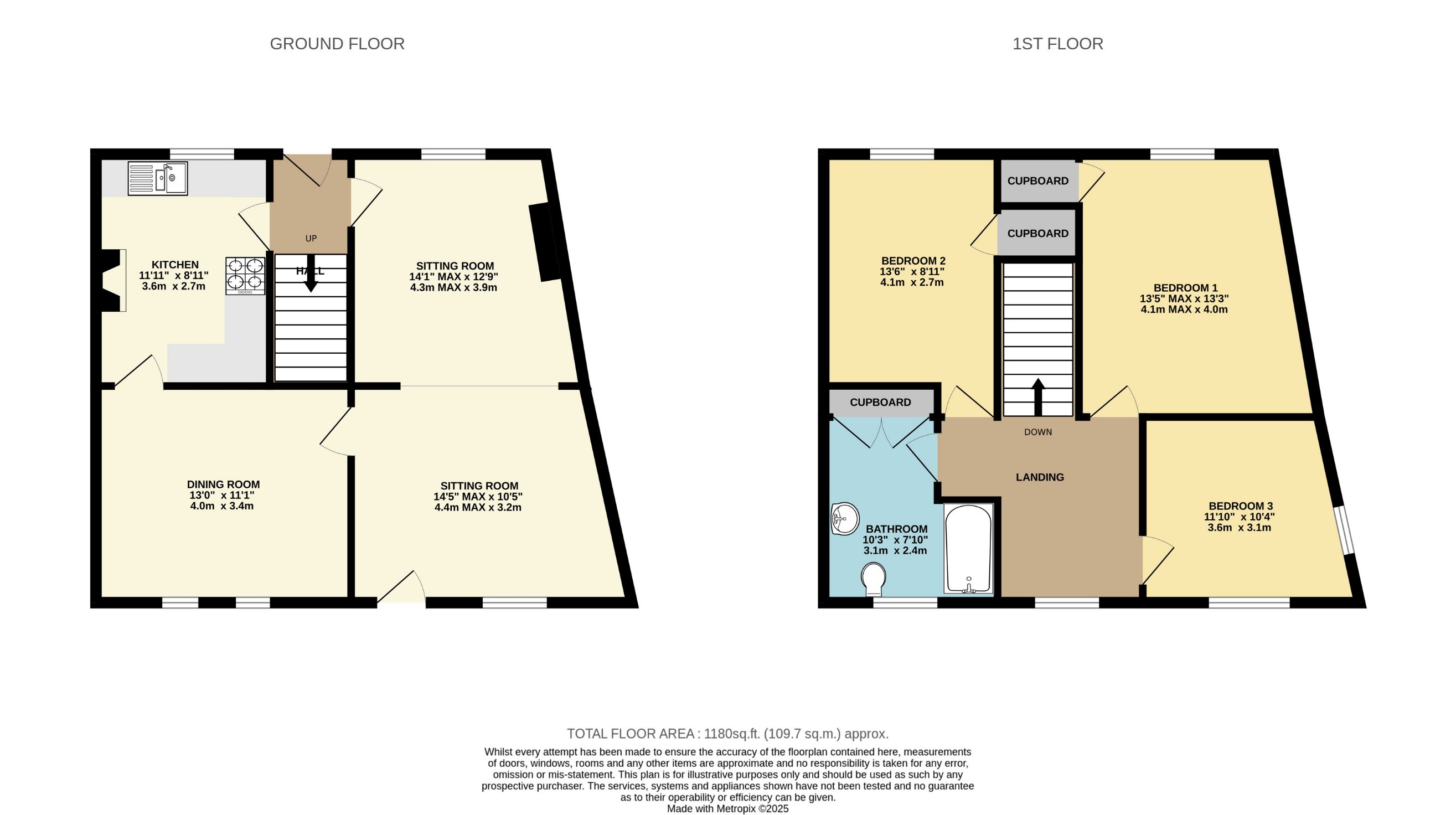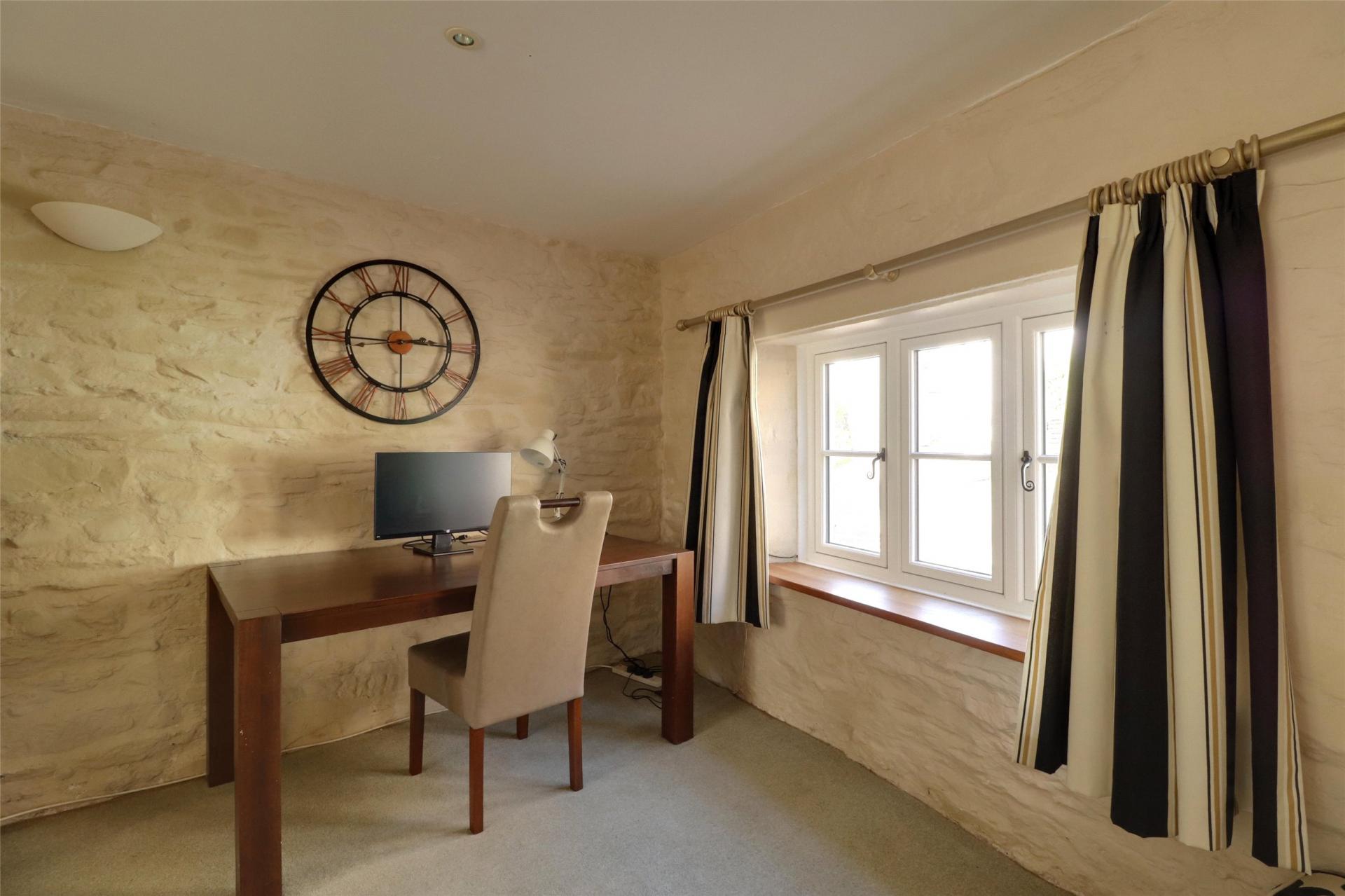 As illustrated in the floor plan, the cottage is entered via the front door into a spacious, double-aspect sitting room featuring an inset wood-burning stove—perfect for cosy evenings. A door leads through to the dining room, which enjoys views to the front elevation. This in turn flows into the charming country-style kitchen, complete with a window overlooking the courtyard. The kitchen is well-equipped with a range of wall and base units, along with integrated appliances including a fridge, dishwasher, oven, and hob.
