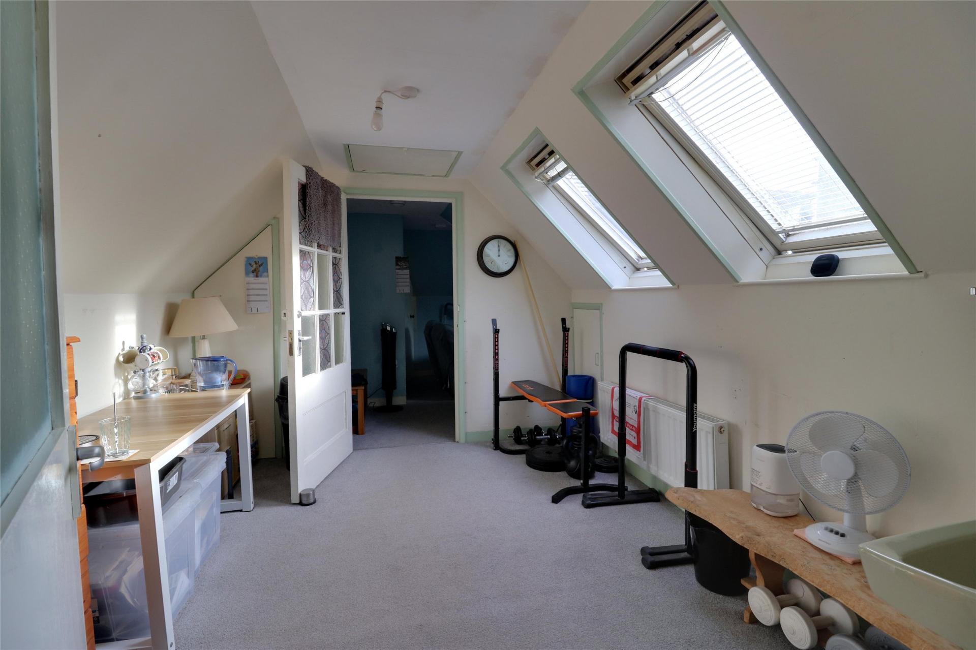 A carpeted staircase from a rear hall gives access to the first floor where there is a two room suite with pedestal wash basin, built in cupboards and eaves storage.