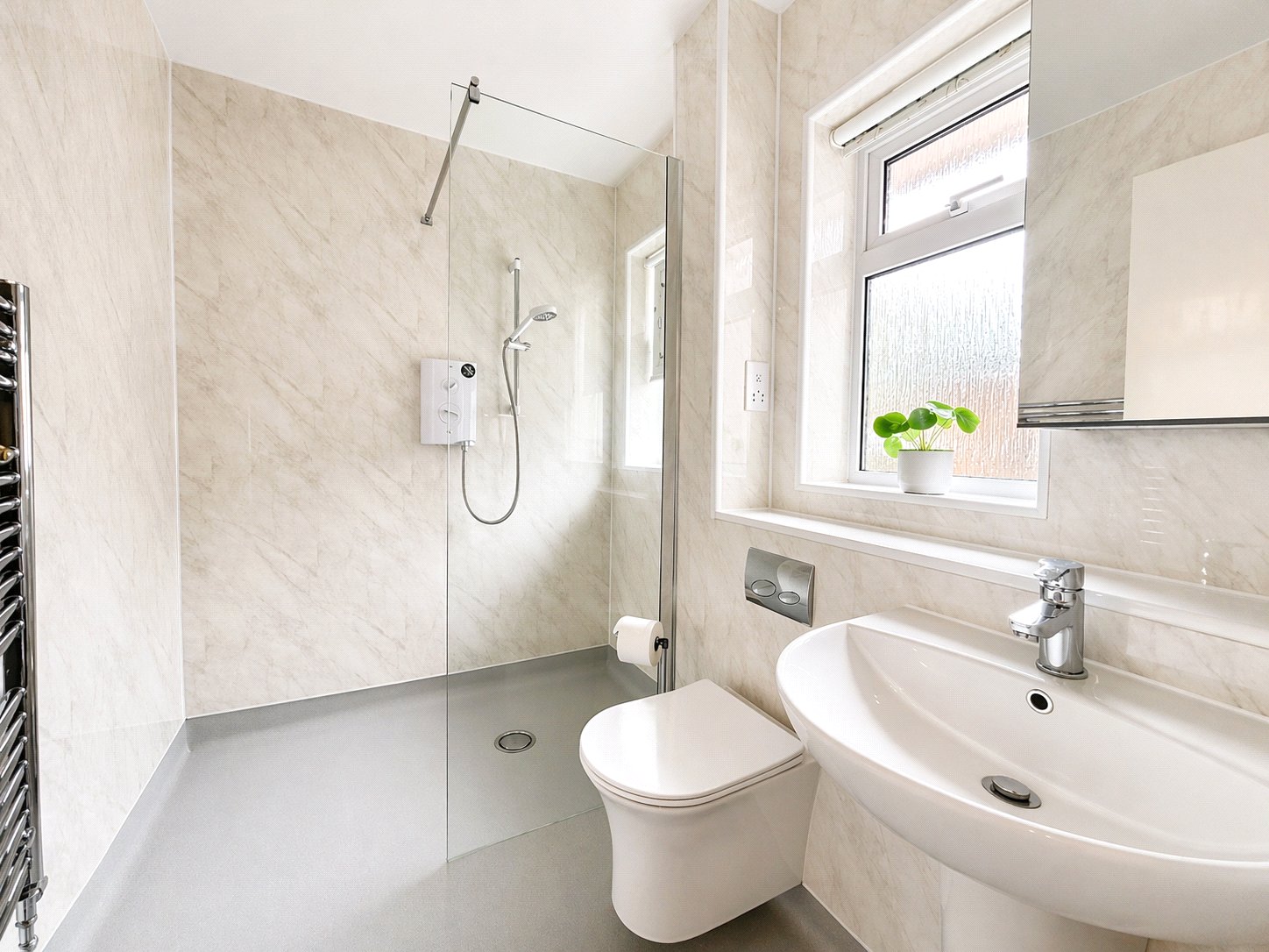 At the front of the property are two further double bedrooms, both fitted with built in storage that adds to the practicality of the home without compromising space. The wet room is contemporary in style and has been arranged for ease of use, providing accessible bathing facilities with clean modern finishes.