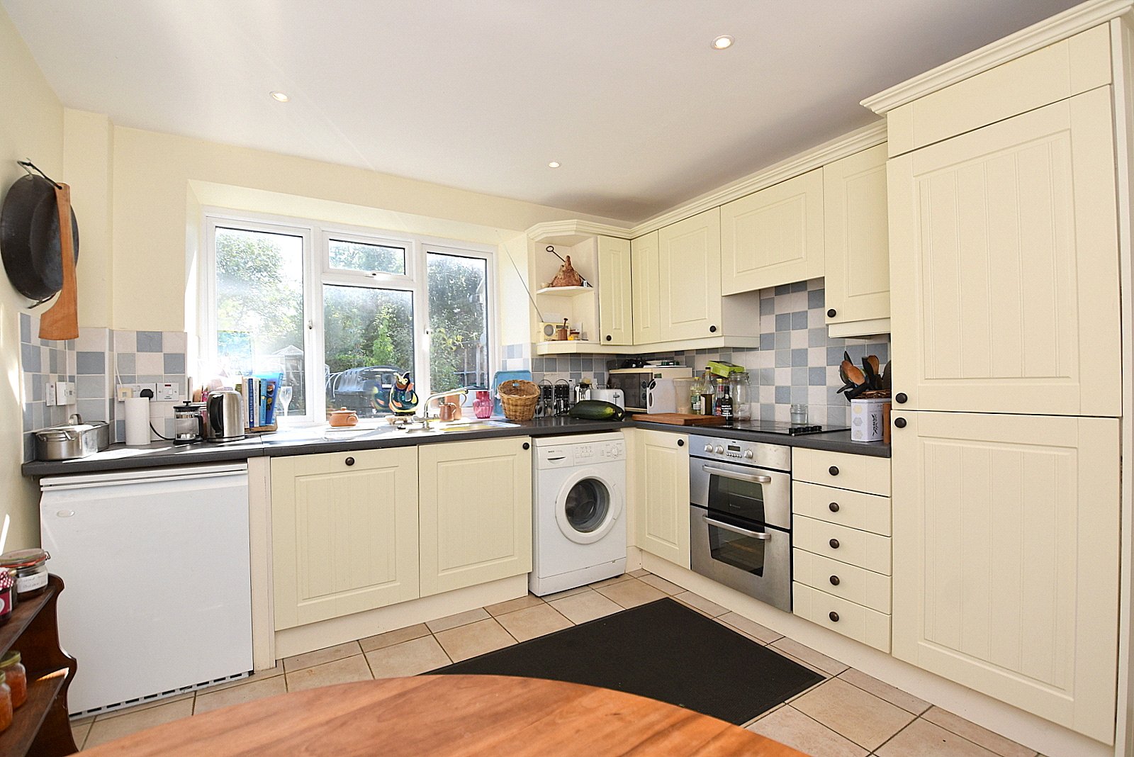 KITCHEN/BREAKFAST ROOM: 12’ x 10’5” Inset 1¼ bowl single drainer stainless steel sink unit with cupboard below, further range of wall, drawer and base units with work surface over, built-in double oven, inset electric hob, oil fired boiler, integrated fridge/freezer, tiled floor, smooth plastered ceiling with downlighters, radiator and double glazed window overlooking the rear garden.